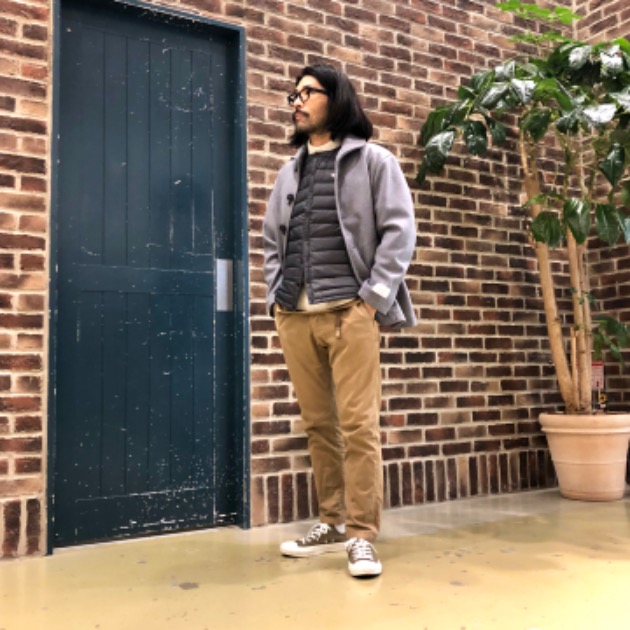 グレーのアウターにはインクブルーのカットソーを使ってマニッシュなカジュアルコーデに!