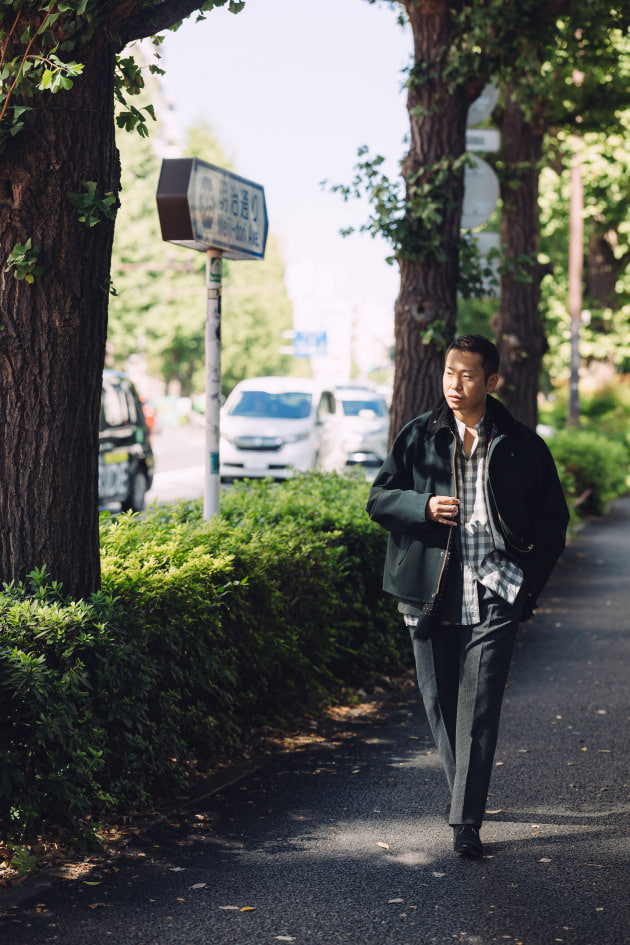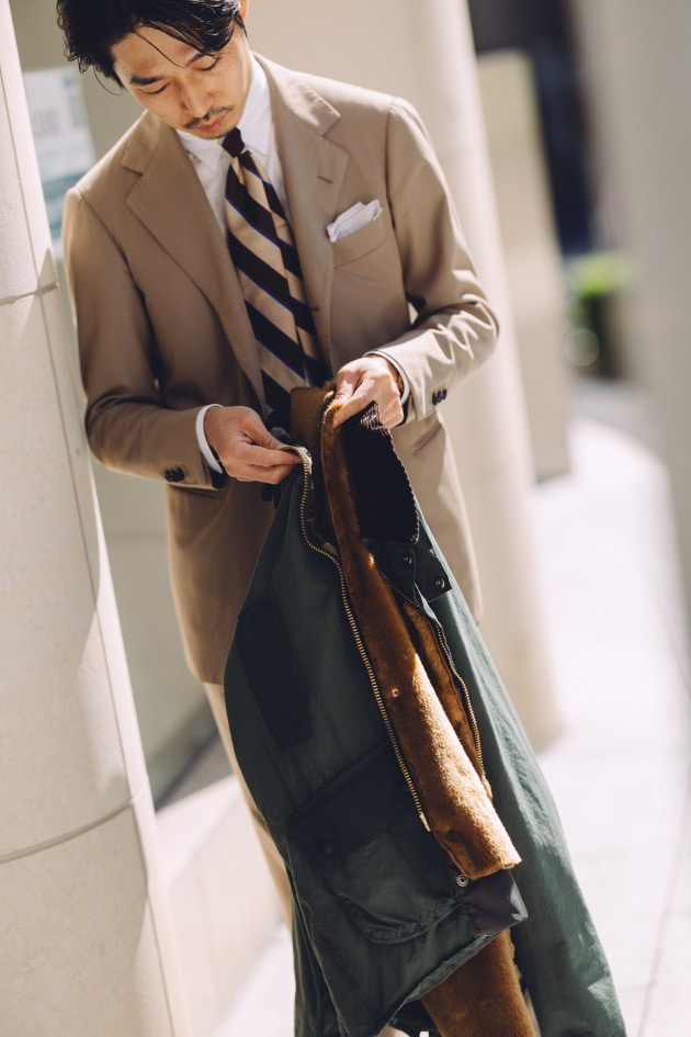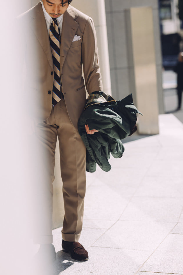 スタッフ細田はスーツスタイルの上から。かっちりとした印象のネイビーストライプスーツをスポーティに寄せて。Vゾーンの動きと絶妙にこなれてマッチしてます。