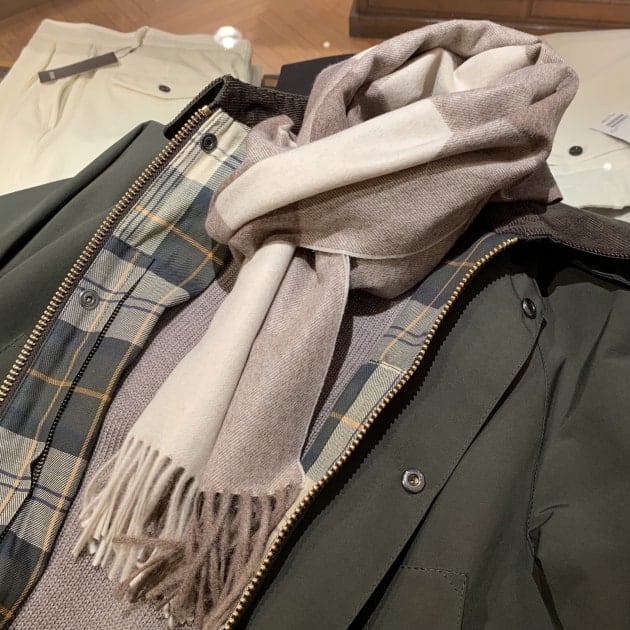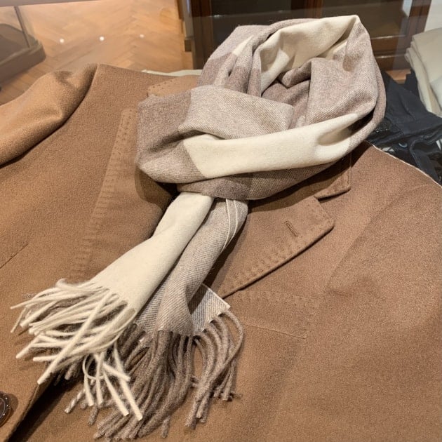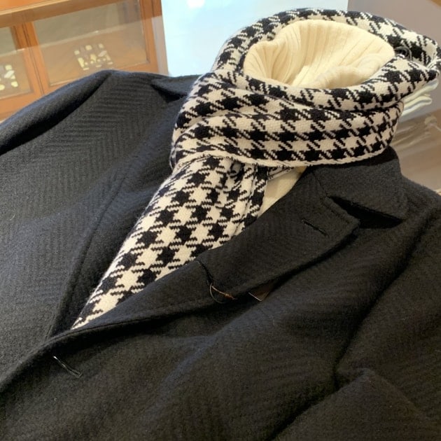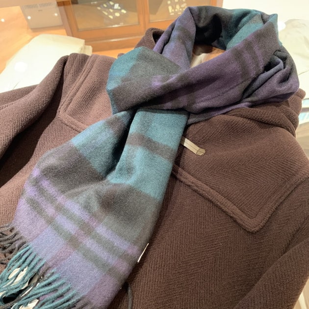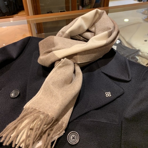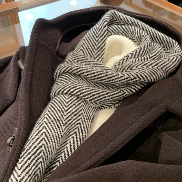 こんな感じでブラックやネイビー、ブラウンとも相性が良く、特にマフラーでいうと色々なコートと合わせやすいというのがおすすめのポイントです。