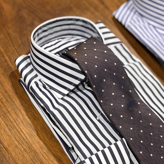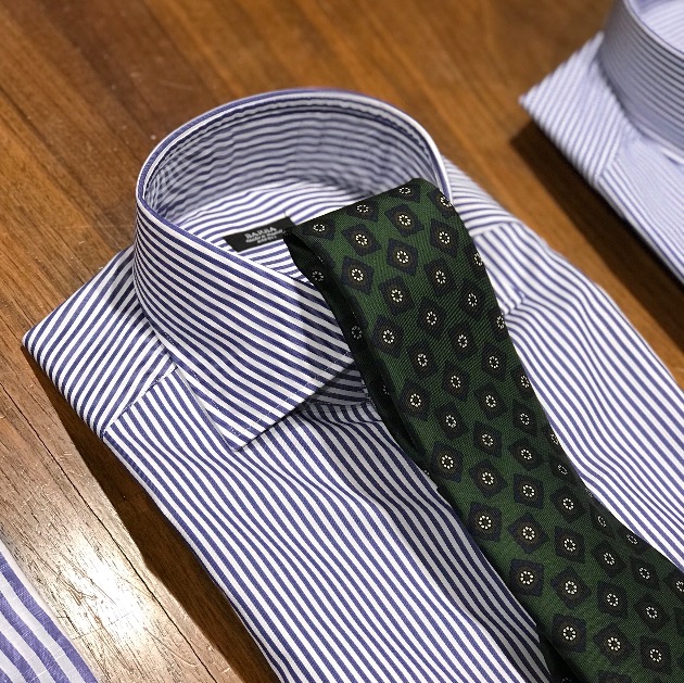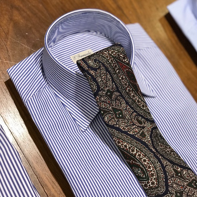 ブリティッシュ・ティストを感じるシャツに、ヴィンテージ調のポルカ・ドットのプリント・タイを合わせて見ました。