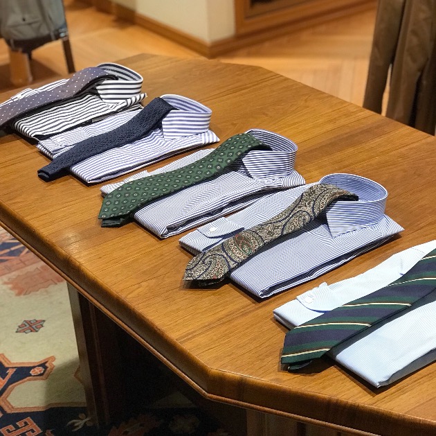 『THUILLIER』のシャツをコーディネートする場合、カラー・スティを外し、カラー・ピンを使ったコーディネートもお勧めです。