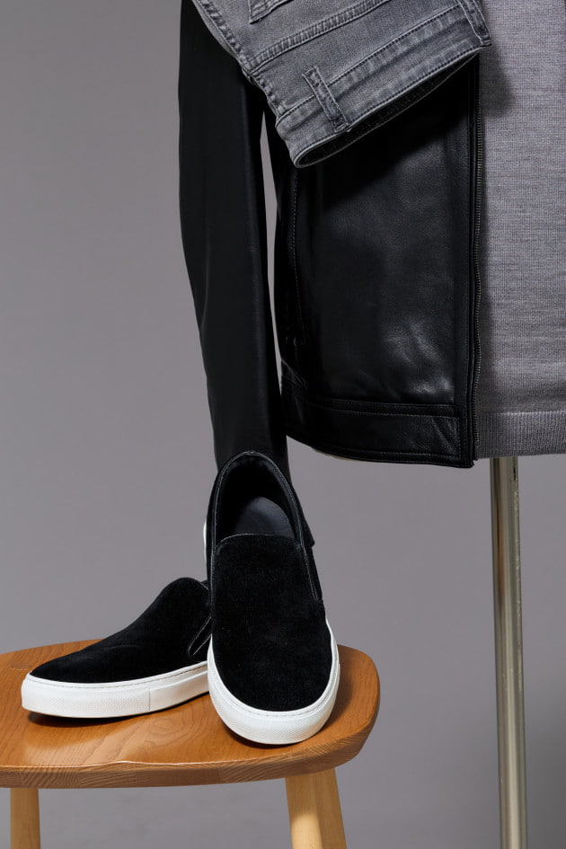 足のラインはPTのスラックスらしいスッキリとしたテーパードシルエット。