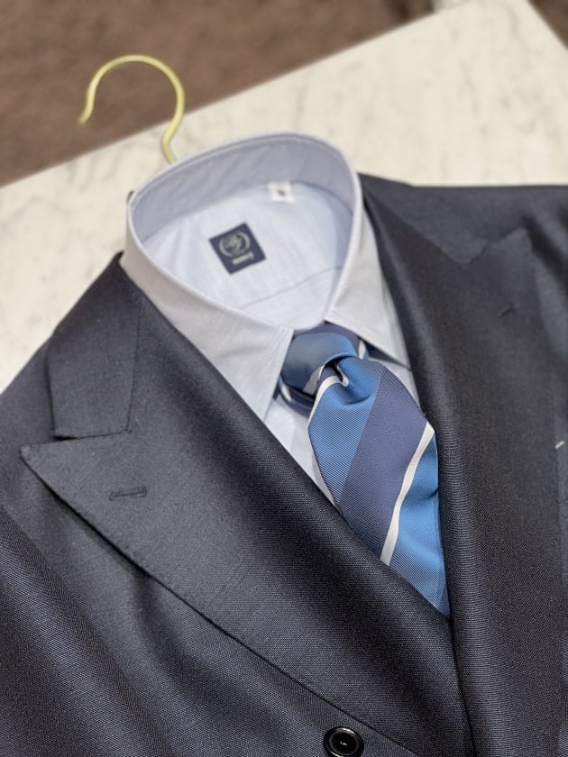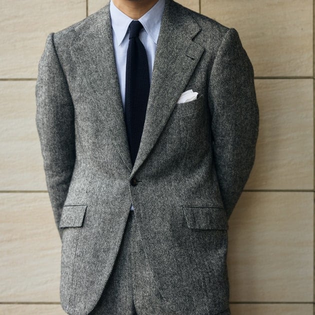 フランネルのスーツにシャンブレーシャツ、カシミアのネクタイを合わせました。