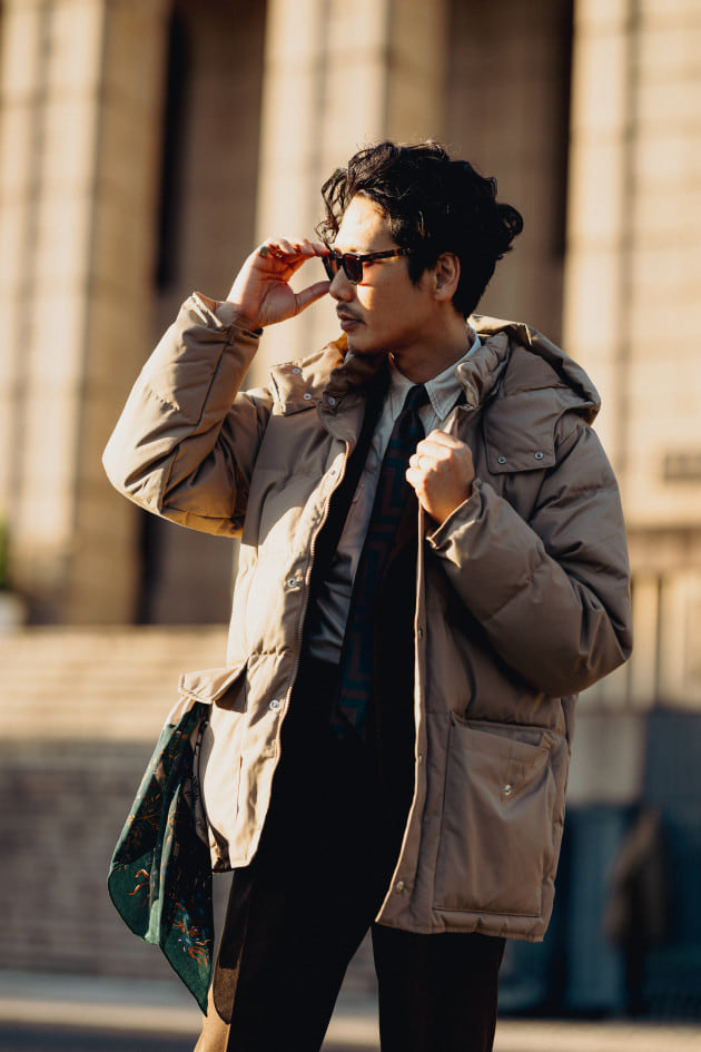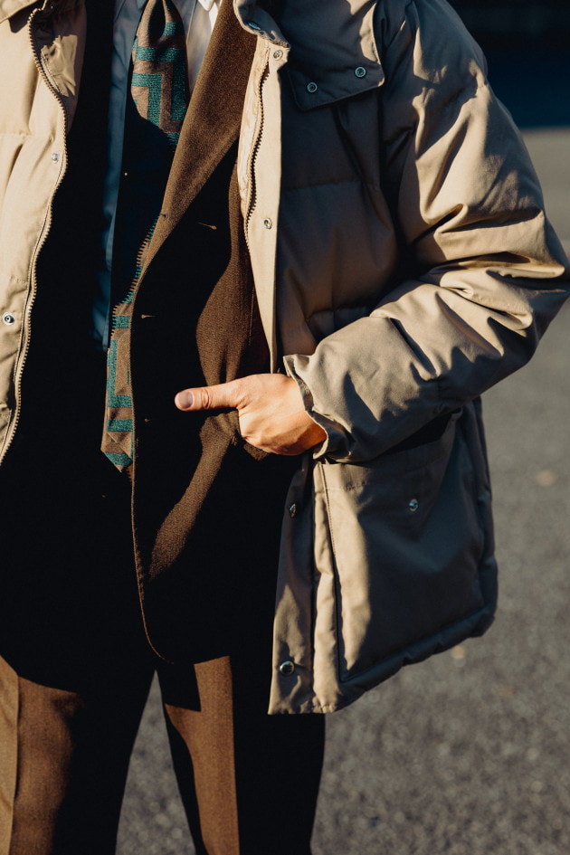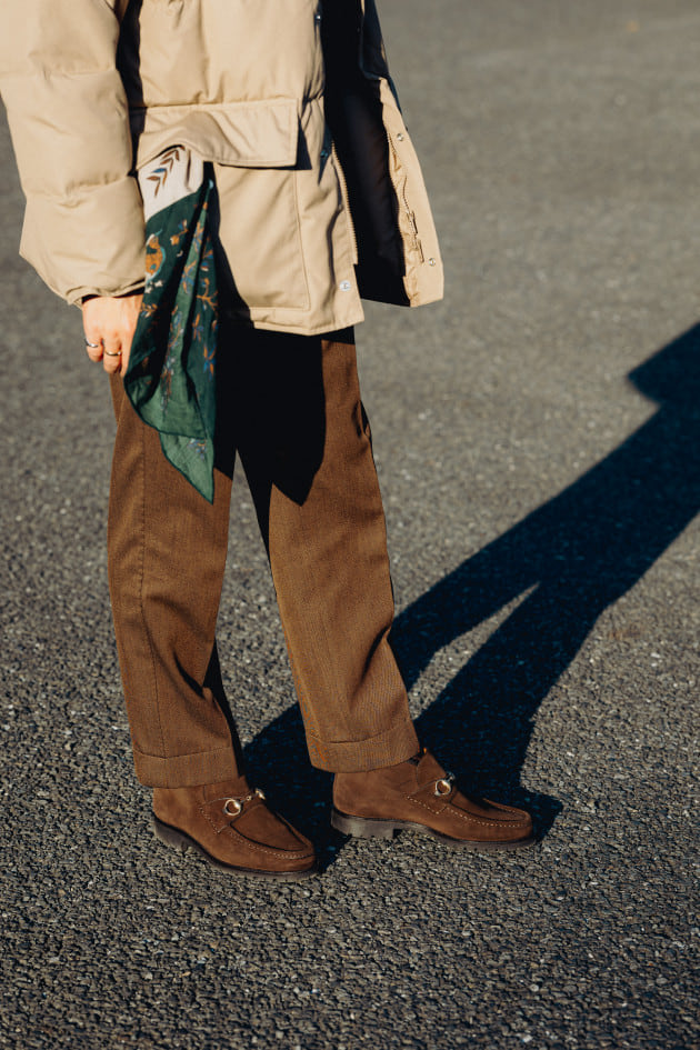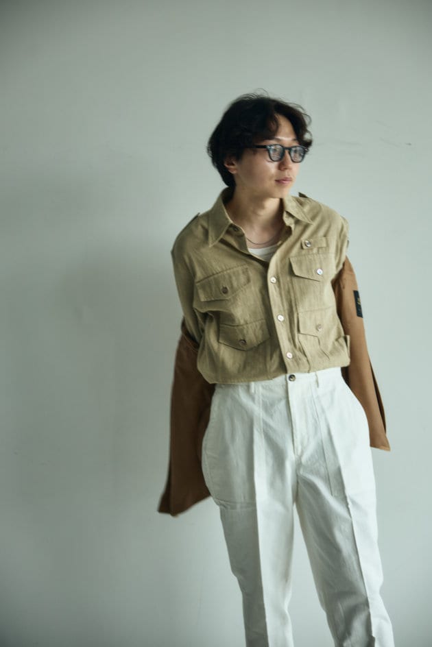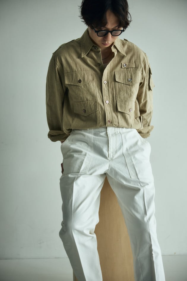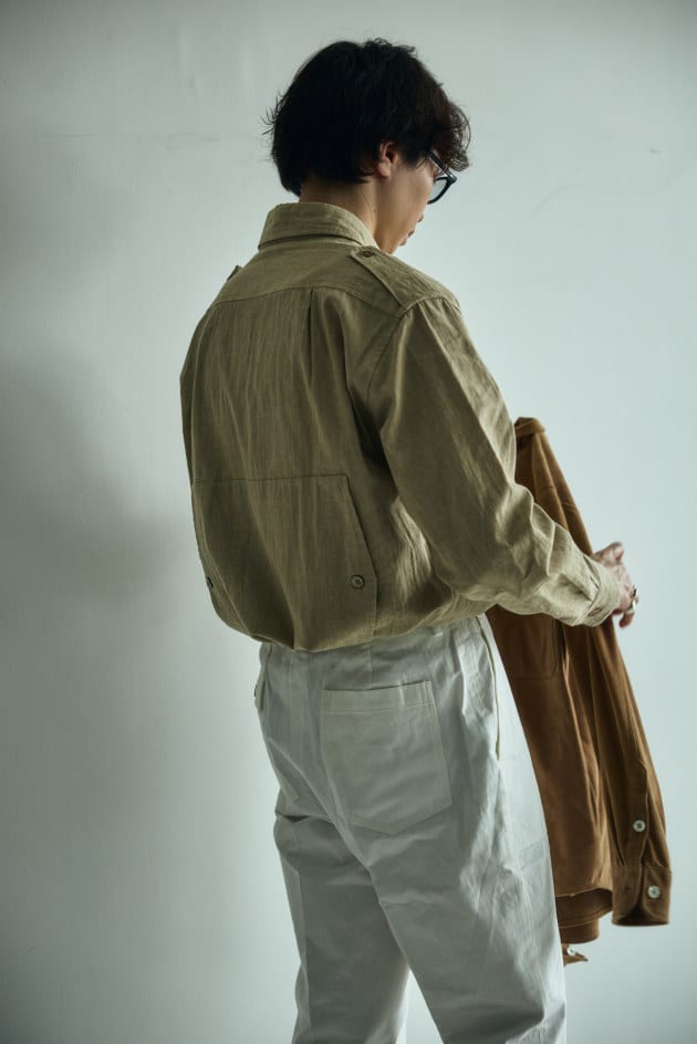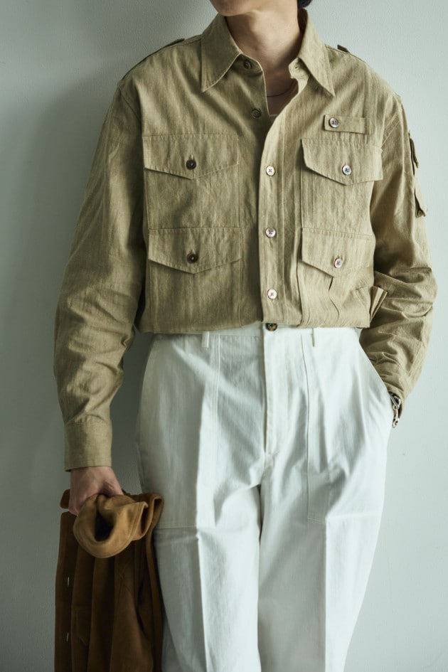 一枚でしっかりと存在感のあるアイテムですが、敢えてインナー使いする着こなしも洒落ています。男クサく寄せてたトップスに、ホワイトのパンツでクリーンに。レトロなサファリムードが今新鮮に映ります。