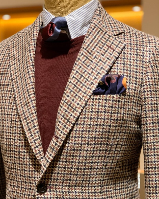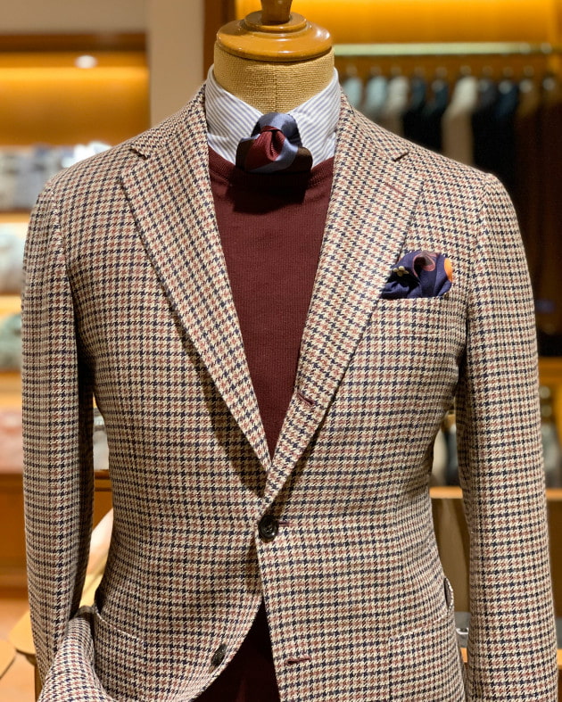 こちらはやや織りの表情がついたストライプ。テラコッタのようなオレンジがかったブラウンに鮮やかなブルー、ボルドーの差し色。全体的にマットな質感で纏められており、派手さのないほどよい主張が上品で紳士的。ざっくりとした質感も立体感があってこなれています。