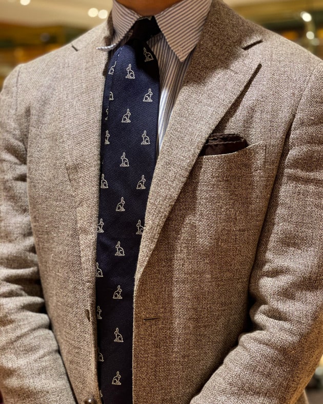 今回ご紹介するのはこちら。アーカイブコレクションより、細かなピッチで彩られた小物柄ネクタイ。