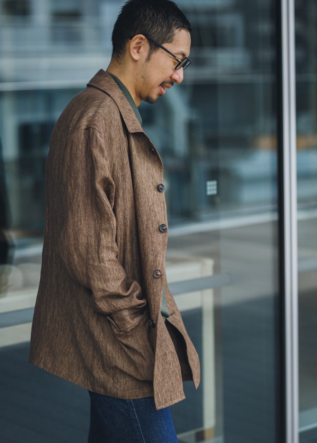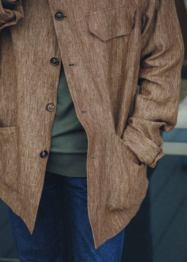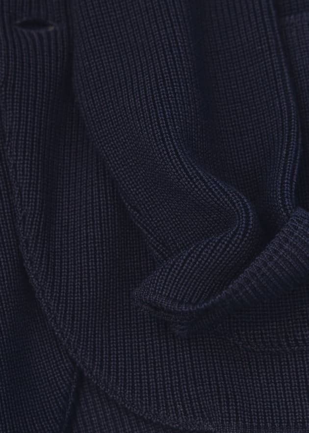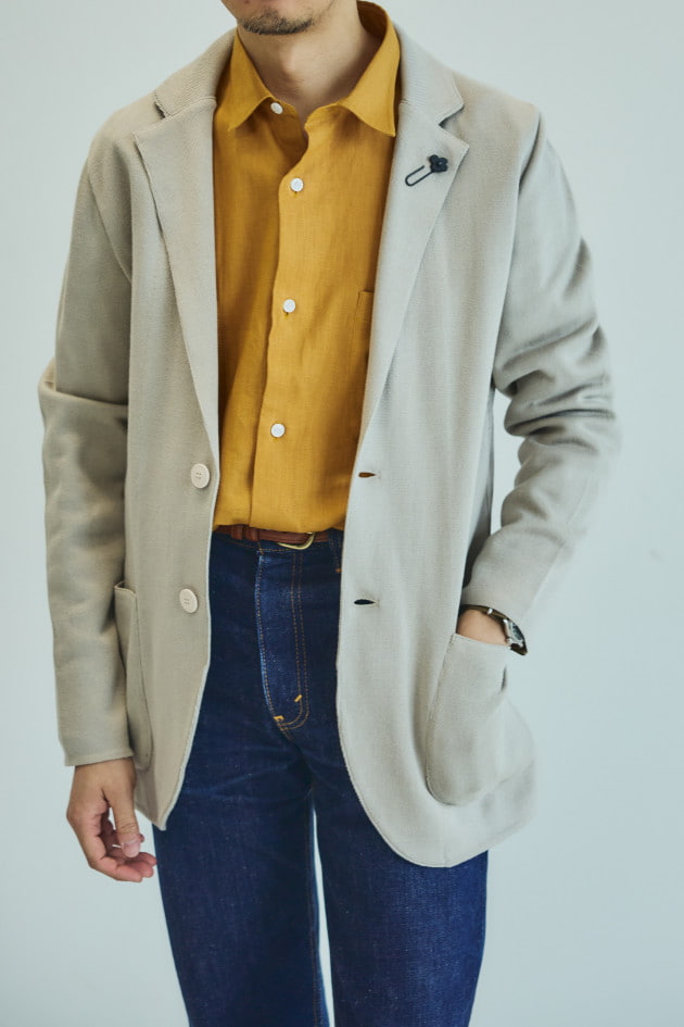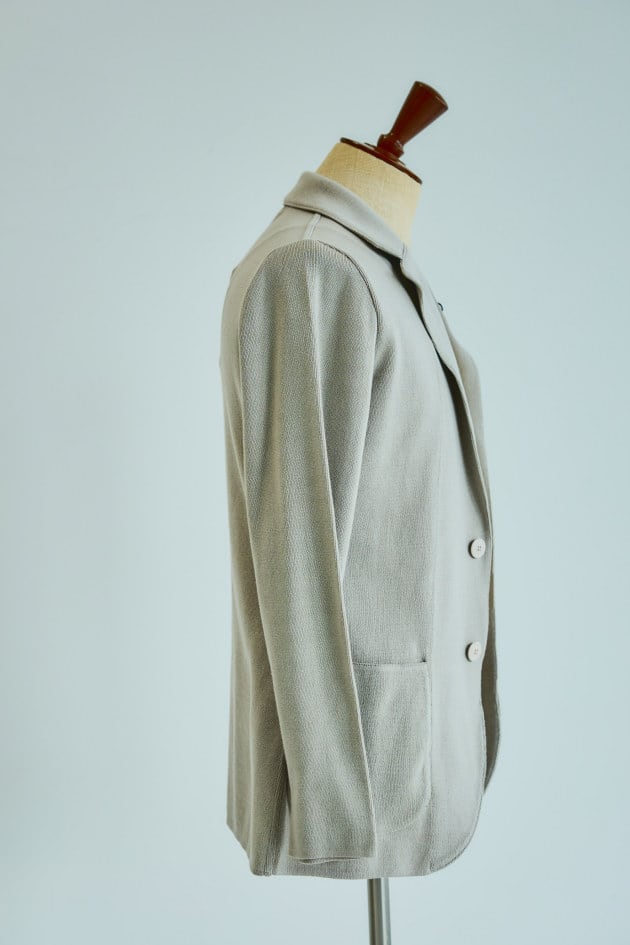 ニットジャケットらしい丁度良い堅さも魅力の一つ。シンプルなジャケットでは少し硬い、でも何か羽織るべき、というシーンにはもってこいの一着です。シワへのケアも気を遣わず、ラフに持ち歩ける点も◎。