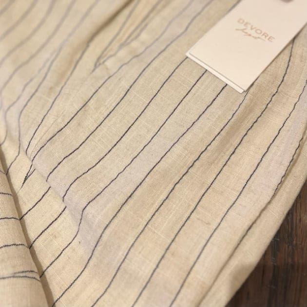 そして注目したい生地。オフホワイト〜ナチュラルの色合いで表現されたベースに、ライトグレーの淡いマッチング。さらっとした織り感に滑らかなタッチの質感がラグジュアリー。何より品のあるカラーコンビネーションが、都会的な上質さを纏う仕上がりです。