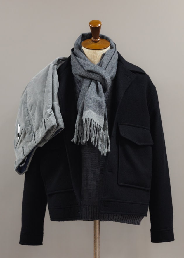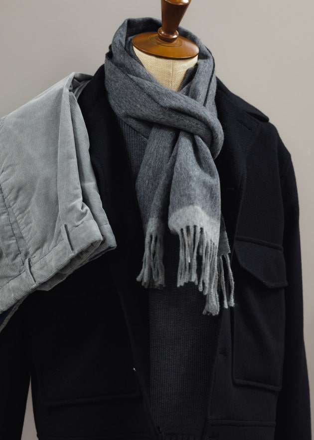 ルックではグレーのワントーンで合わせていました。ダウンジャケット〜ニットまで絶妙なグラデーションをつくり、ラグジュアリーかつ上品な奥行きのあるスタイルに。都会的な余裕のある大人に装いです。