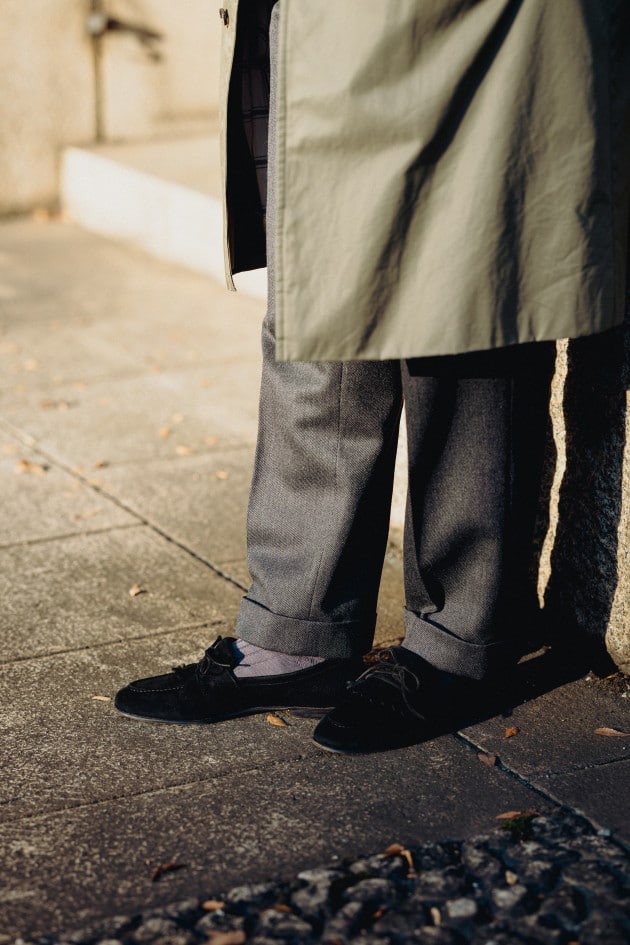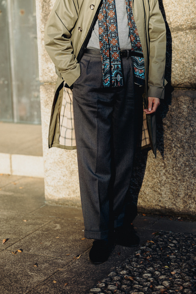 ボトムをスラックスにしたら、カジュアルとはいえどスマートな印象に。