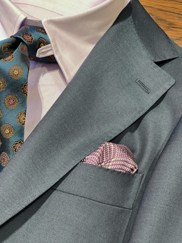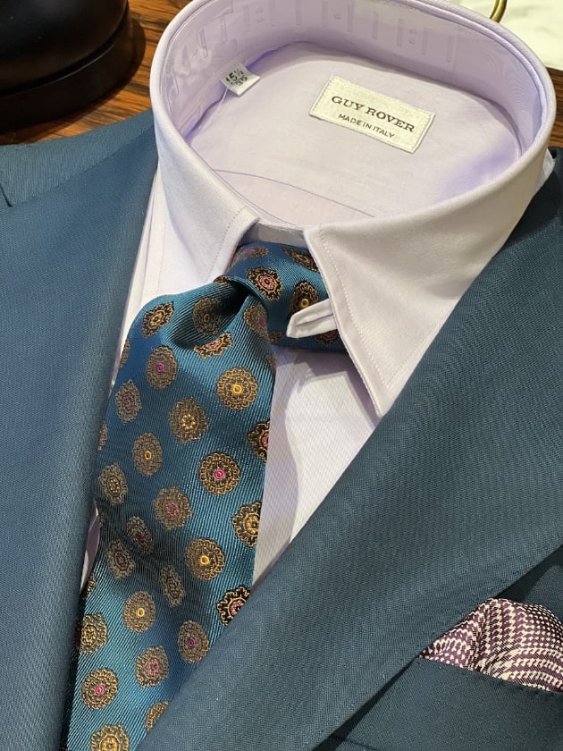 ブルー×グレーを混ぜたようなカラーのスーツにパープルのタブカラーシャツとエメラルドグリーンカラーの小紋柄ネクタイの組み合わせ。