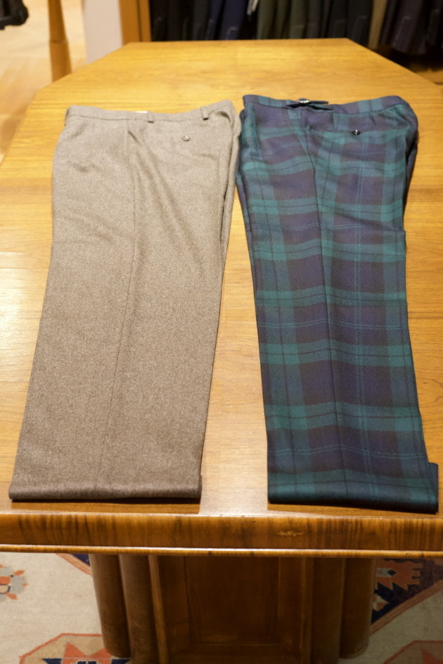 私もずっとワイドモデルでチェックパンツが欲しくて、以前の<BERNARD ZINS>オーダー会でブラックウォッチのパンツをワイドモデルでオーダーしていました。かなり気に入っております。