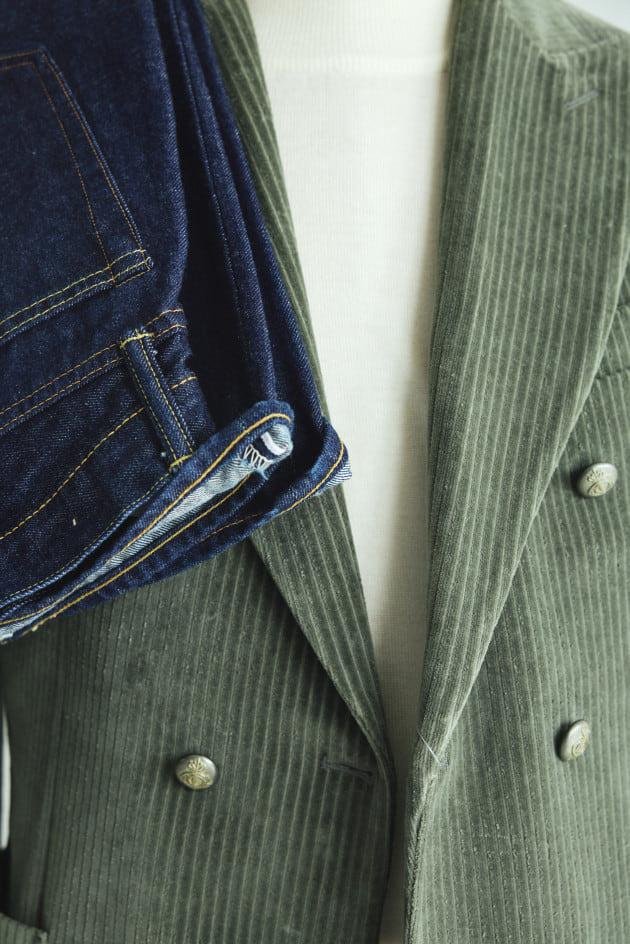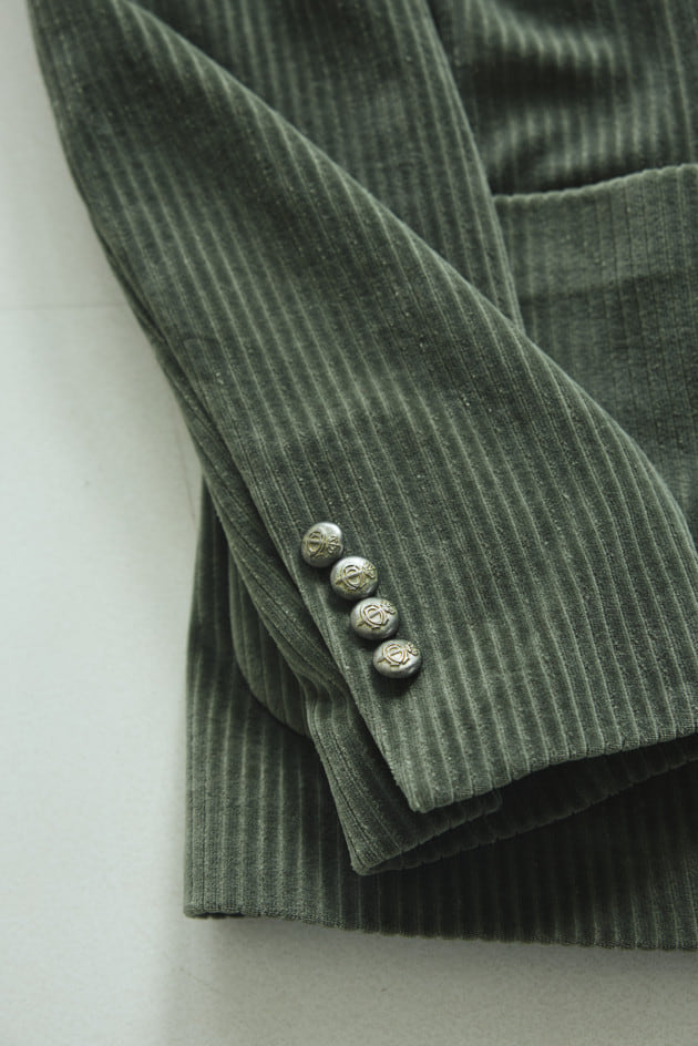 ボタンはメタルボタン仕様。ヴィンテージ加工が施されたメタルボタンは、コーデュロイとのマッチングがこなれたバランス。掠れたグリーンの色出しとの馴染み具合も洒落ています。