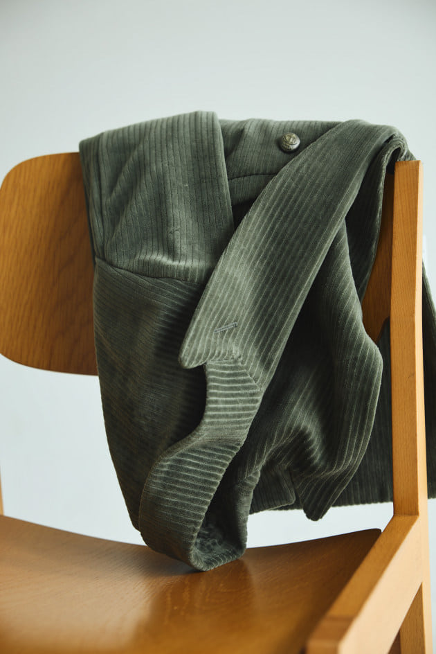 コーデュロイと言っても、所謂なカントリームードではなくモダンなコーデュロイ。コットンにポリエステルをミックスし、硬さを取った非常に滑らかでしなやかな身のこなし。畝の表情も強すぎず、前に出過ぎない、さりげないコーデュロイの主張が大人っぽく表現されています。