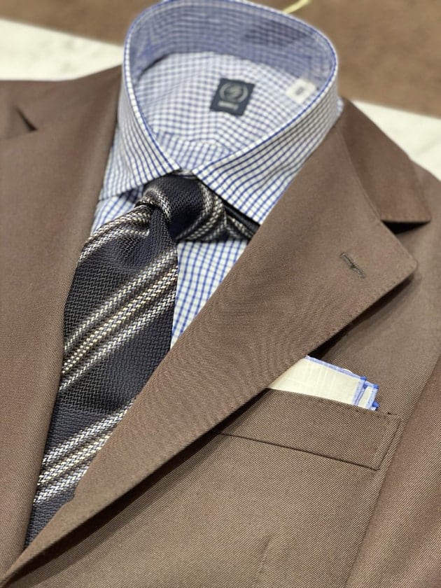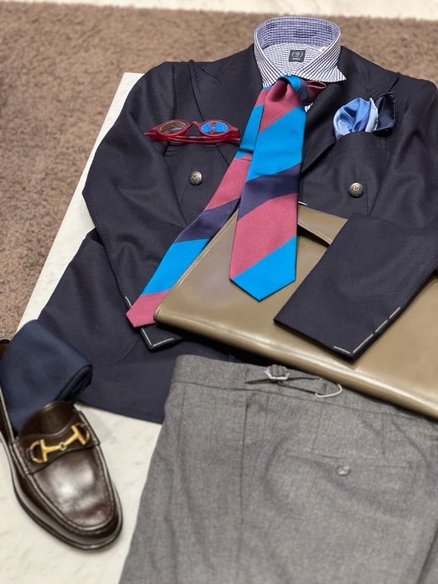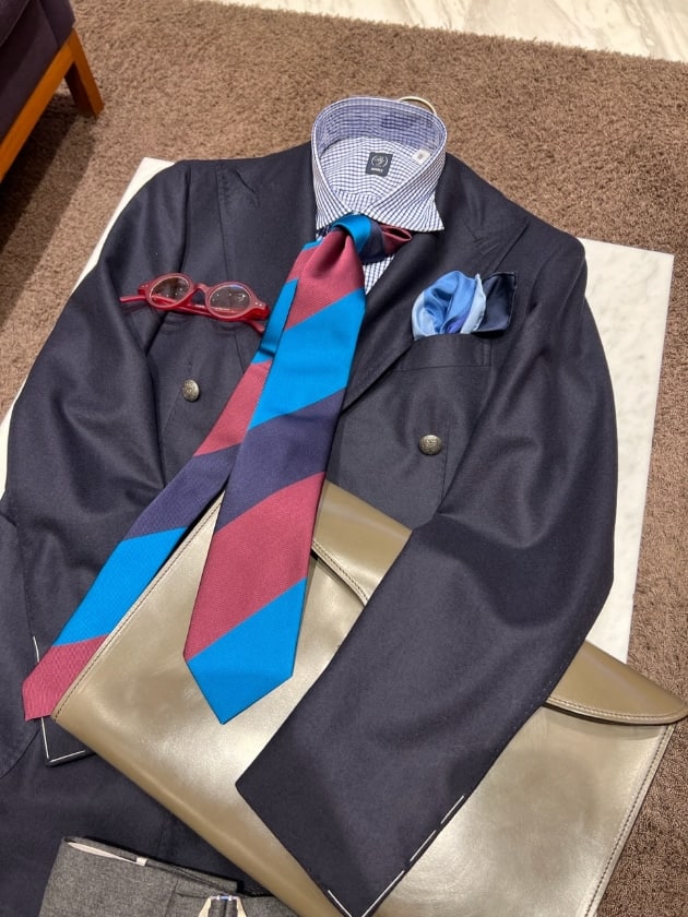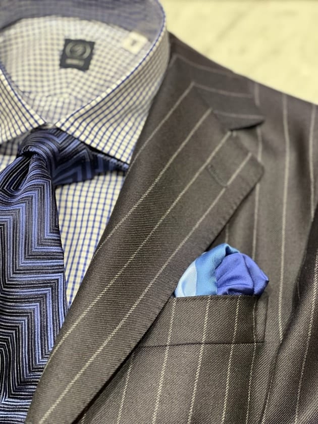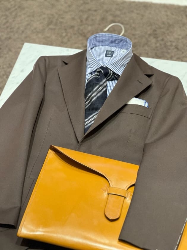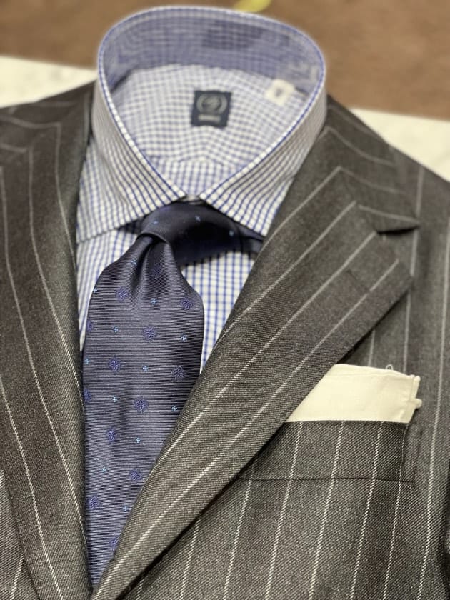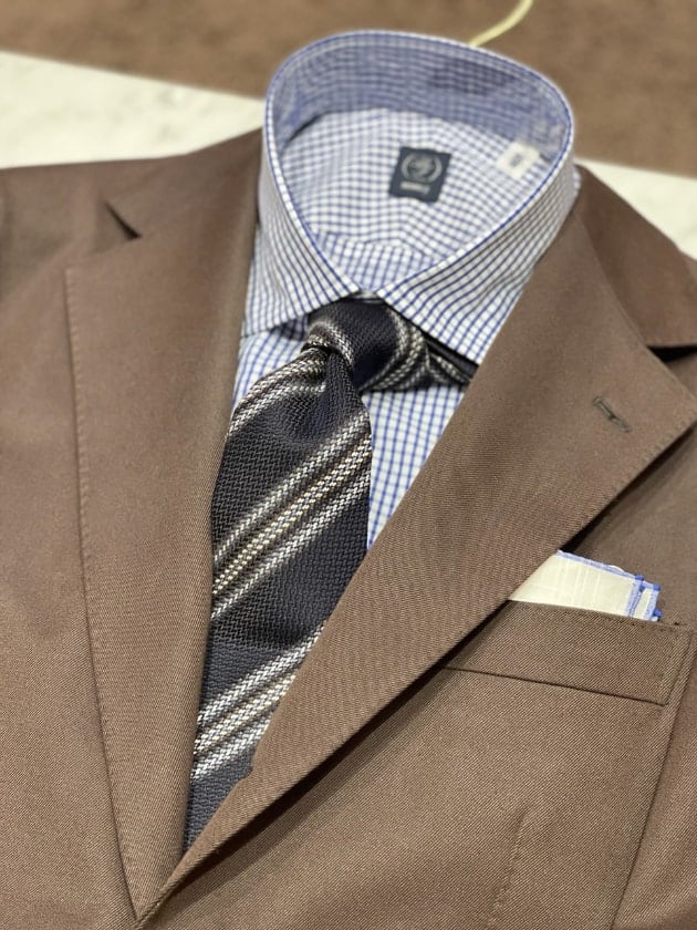 チェックのジャケットをオープンカラー