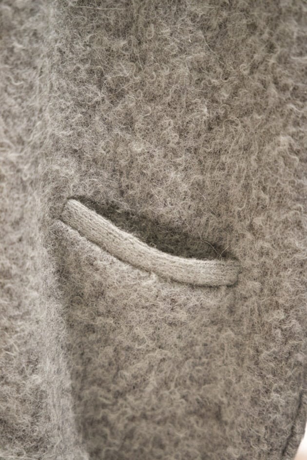 極上のベビーアルパカをダブルジャカード織りし、クラシックな起毛機でモヘアの起毛感を表現しております。
