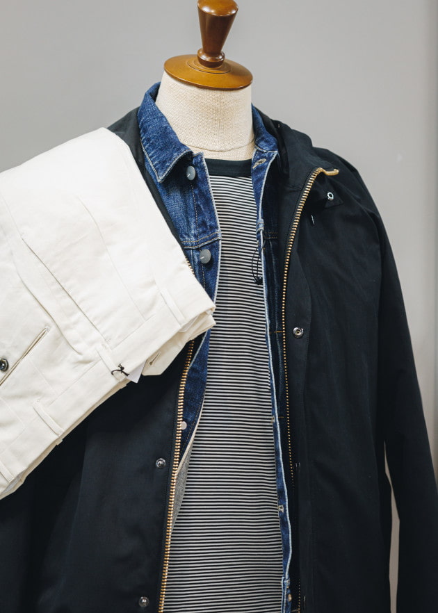 着丈をほんのりと長く設定し、腰にはスラントポケットを配置。男らしくシャープなシルエットながらラギッドすぎない品のある空気感が絶妙な顔つきに。