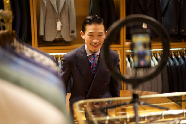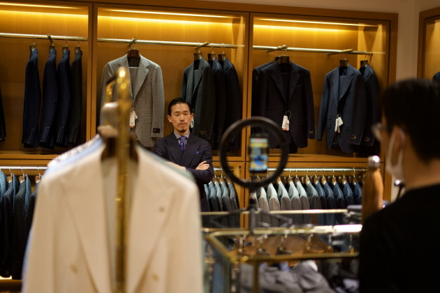 近年型数が増え始めたレギュラーカラーシャツに、トレンドのブラック×ホワイトのやや細めのストライプ。
