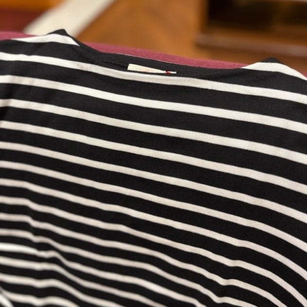 ボードネックのカットソーですが、ネックの開きが大きくないので、タンクトップやTシャツを中に着る必要もないです。