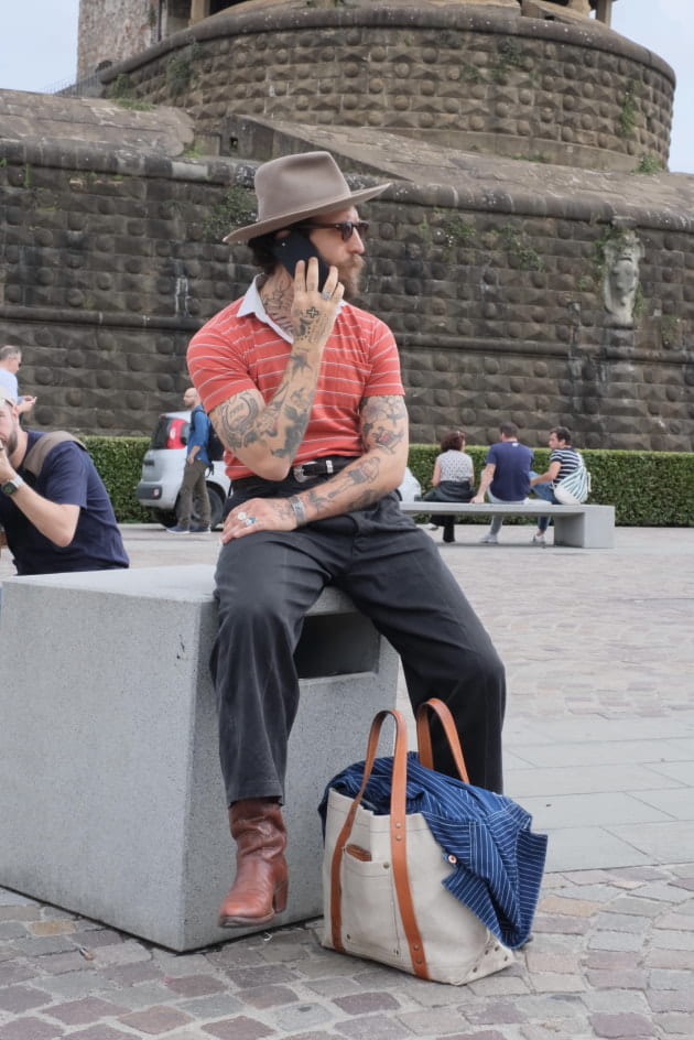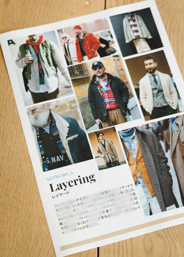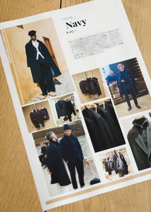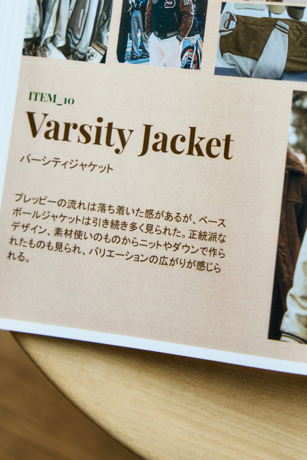 「フライトジャケット。これは、サプライヤーの打ち出しというよりも来場者、業界人の着こなしに多く見られたアイテムです。B3を始めとしてA2、G1などスタイル、ディテールも様々。数年前はエレガントなドレススタイルに袖を通さず肩にかけた、そういったムードとしての取り入れ方のような着こなしが見られましたが、今回は一つのアイテムとして取り入れているスタイルがほとんどです。直球に合わせるのではなく、プレッピーなテイストとのミックスや、タイドアップにジャケットの代わりとして合わせていくような、ドレスの要素をほんのり混ぜてこなすスタイルが多い印象でした」