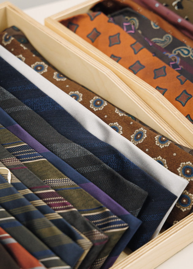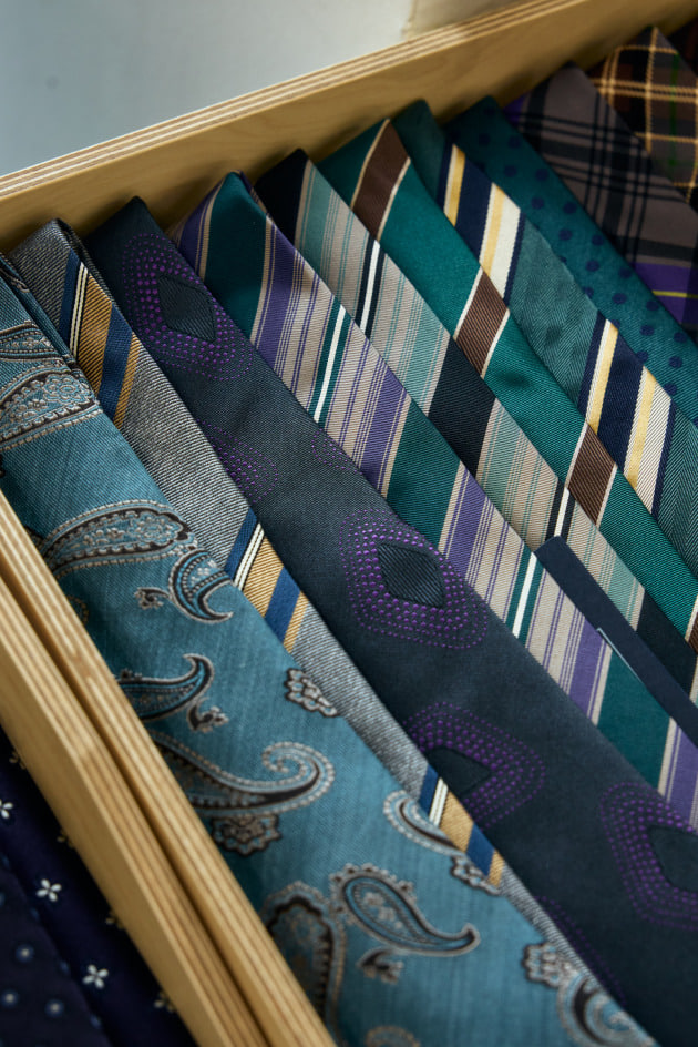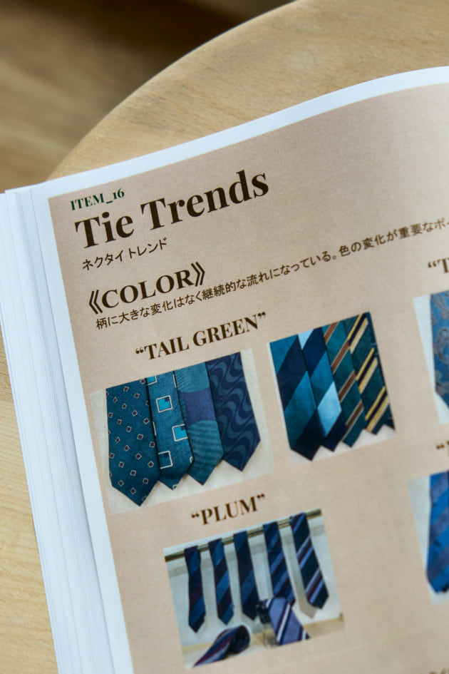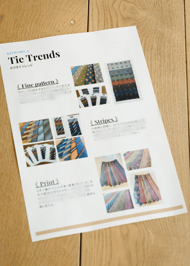 「今回特に目を引いたのがブラックベースのネクタイ。そこにピンクやブルーを差して表現するような柄出しが多く見られました。続いてグレーベース。中でもミディアムグレーが目立っており、ブルーやブラウンを織り交ぜて見せるパターンに、敢えてワントーンで仕上げたものもありました。毎回トーンを変えて打ち出されるブルーでは、前回の流れから空の色を表したようなアヴィオブルーが継続して注目されています。グリーンでは明るめのグリーンからスモーキーな秋冬らしいオリーブまで、幅を広げて提案されている印象です。鮮やかな色ものではパープルとピンク。どちらも温かみのある色出しが多く、ローズピンクなどの柔らかなカラーパレットを中心として取り入れられています。中にはブラックとのコンビネーションも見られ、80年代ムードのような印象のアイテムも提案されていました」