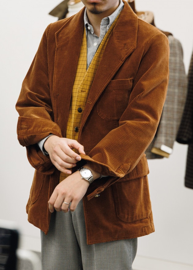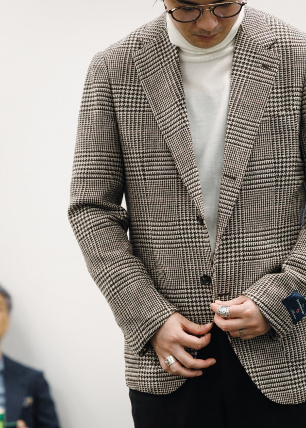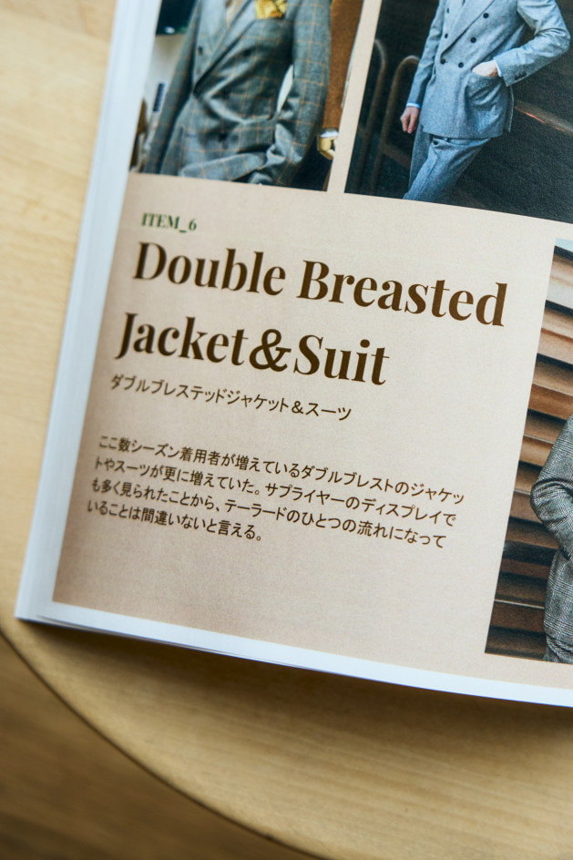 「ダブルブレストのジャケットやスーツが多くのサプライヤーから打ち出されています。これは2〜3年ほど前から出てきている流れですが、今回はさらに増えてきたなという印象です。日本においてはダブルブレスト=堅い、重たいというイメージがややありますが、欧米ではそういったことはなくシングルジャケット同様に自然と着こなしに取り入れられています。きっちりとしたタイドアップももちろんありますが、ニットやカットソーなどを合わせラフな雰囲気で着流したダブルブレストのスタイルが提案されていました。落とし込まれている素材もカジュアルに合わせられるものが増えてきています」