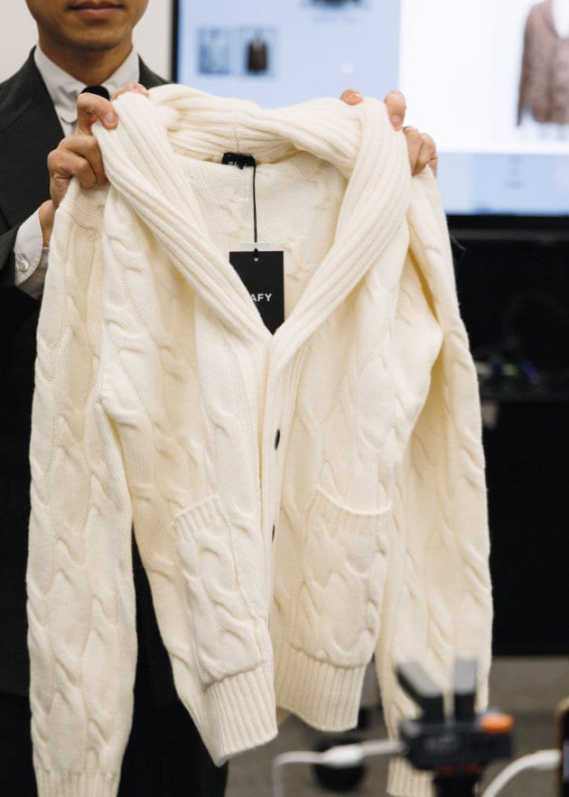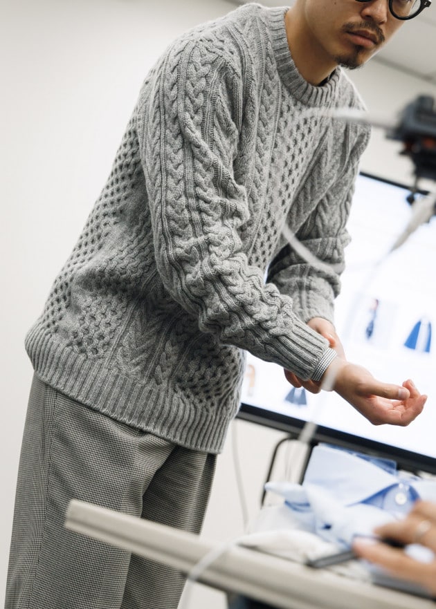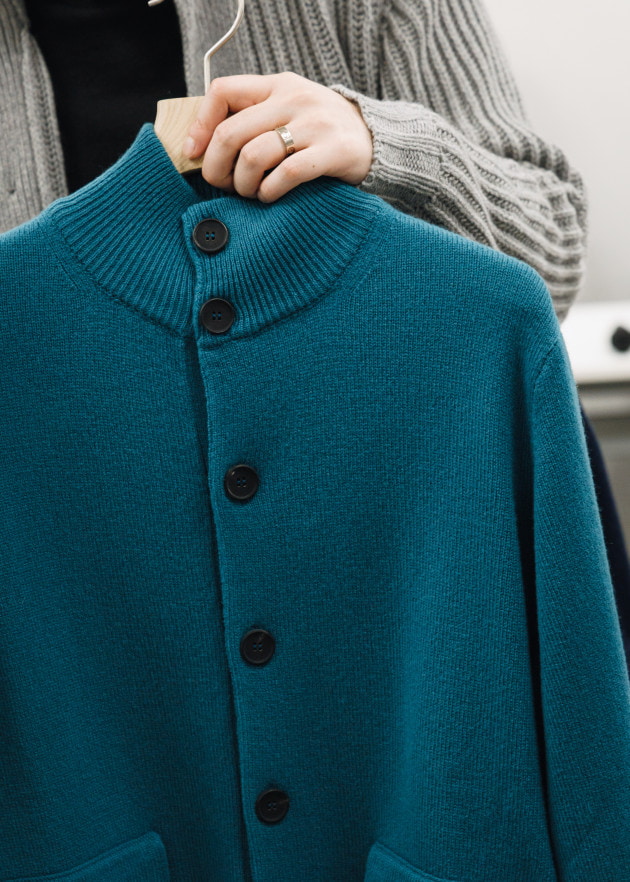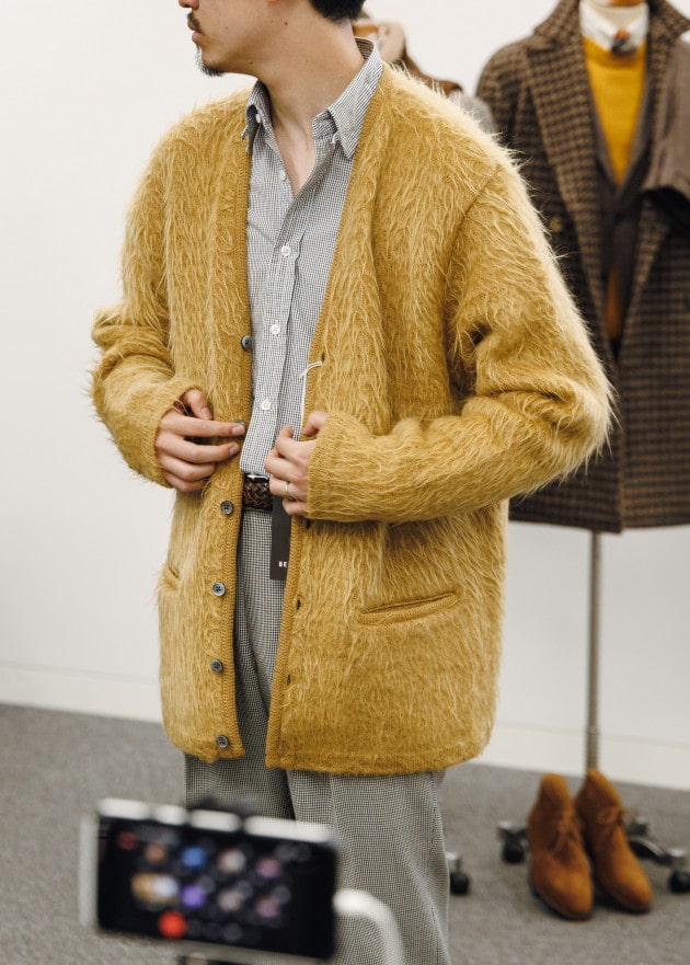 「リラックス感というキーワードからカーディガンが注目されています。着こなしにレイヤードするようなハイゲージのものというよりも、メインとして取り入れられるアイテムが多く見られました。これはジャケットに変わる羽織りものという視点からもあり、ビジネススタイルのカジュアル化に伴うジャケットを着ない、けれども羽織りものが必要というところからも需要が出てきていると思います。昨年に続いてショールカラーのものが多い中で、ポロカラーで表現されたものなどバリエーションも増えており、ざっくりとした素材感を中心に落とし込まれています」