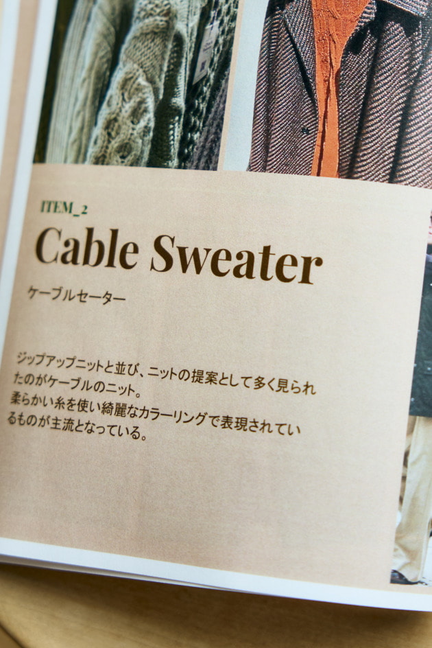 「パターンドニット。ドレススタイルのカジュアル化に伴い、リラックス感というものが全体的に意識されている中で、ニットにもパターンを取り入れることでリラクシーに仕上げたものが多く見られました。アーガイル、ノルディック、ヘリンボーン、ボーダー。シンプルなパターンからケーブルのように編み地で表現したものまで様々です。オーセンティックなカントリームードにモダンで都会的な空気感を取り入れたものなど、そのバリエーションも非常に豊富です」
