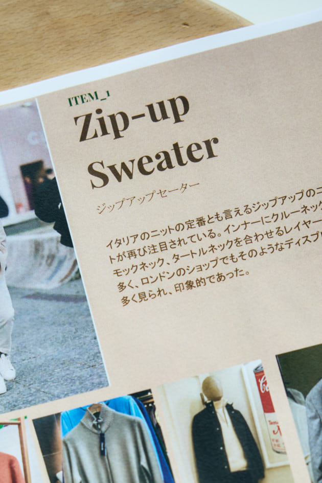 「昨年あたりから流れとしてあるジップアップセーター。モードやカジュアルの観点からも注目されているということもあり、そこからの関連という側面もあります。ただ、一過性のものではなく、イタリアでは定番のアイテムとして馴染みあるものです。ハーフジップを中心としてフルジップも提案されていました。ドレスクロージングではニットに落とし込まれているものがほとんどですが、カジュアルなど広く見るとスウェットで表現されたものもも多く見られます。これまではシャツとのレイヤードが基本的なスタイルでしたが、タートルネックやクルーネックなどを合わせてモダンにこなした、リラックス感のある着こなしが注目されています」