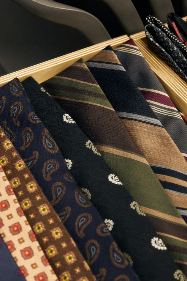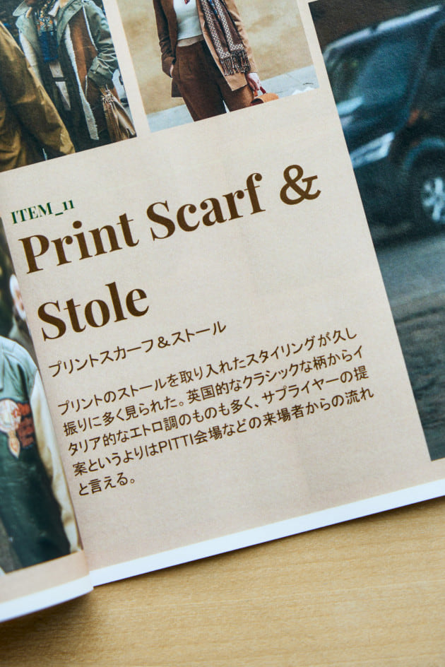 「リラックスムードの流れからネクタイの需要が減ってきてしまっている中で、サプライヤーからはスカーフやストールの提案が増えてきています。また、暖冬の影響からマフラーでは重たいといった側面からも関心を集めており、実際に来場者や業界人の着こなしにも非常に多く見られました。ネッカチーフからショール、ストールなどディテールも様々。落とし込まれているパターンも偏りなく豊富に提案されています。巻き方に関しては、特に傾向はなく自然な取り入れ方が多い印象です」