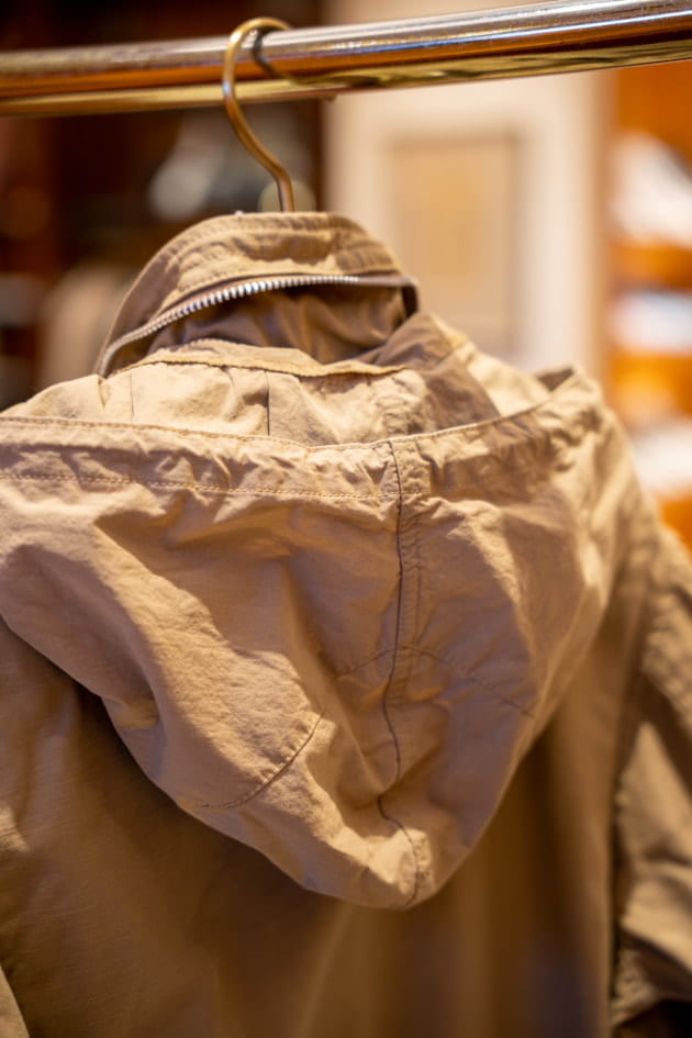 玉虫色の生地を使用したアイテムは最近では比較的クリーンな印象を受けるものが多いですが、こちらはミリタリージャケットらしく、洗いざらしでいい感じに着古した雰囲気が出ています。
