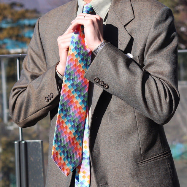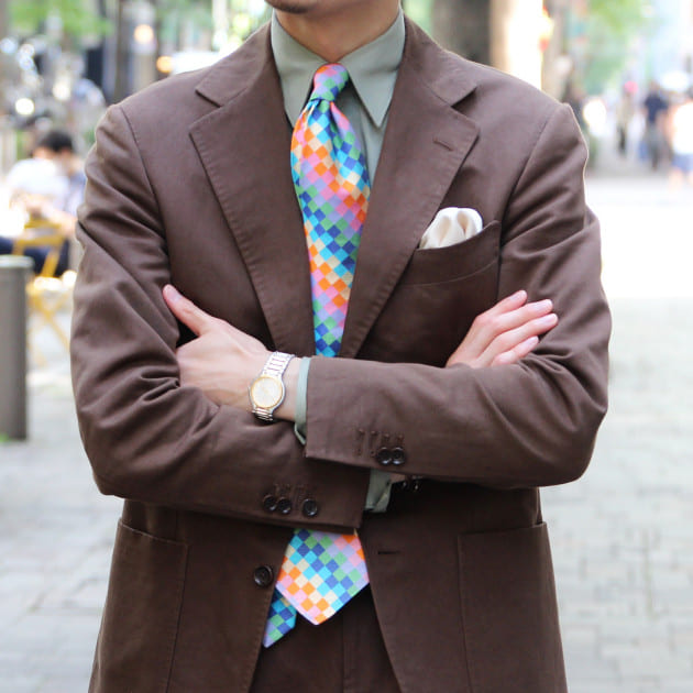 このタイを見て真っ先にしたいなと思いついたコーディネートはブレザースタイル。こんな感じでブルーのグラデーションに合わせてグリーンを引き立てるようなバランスが良さそうです。