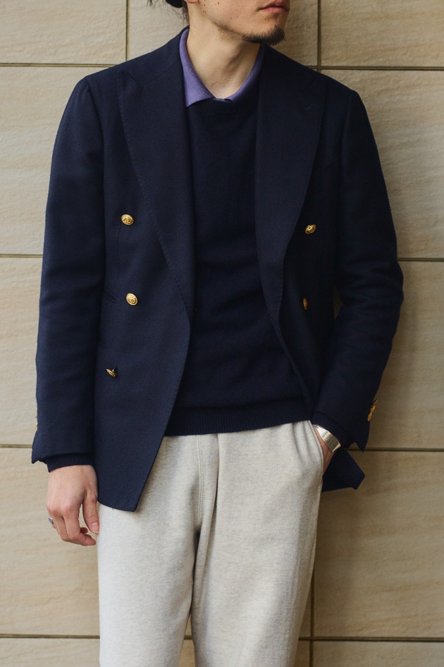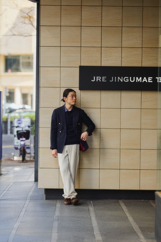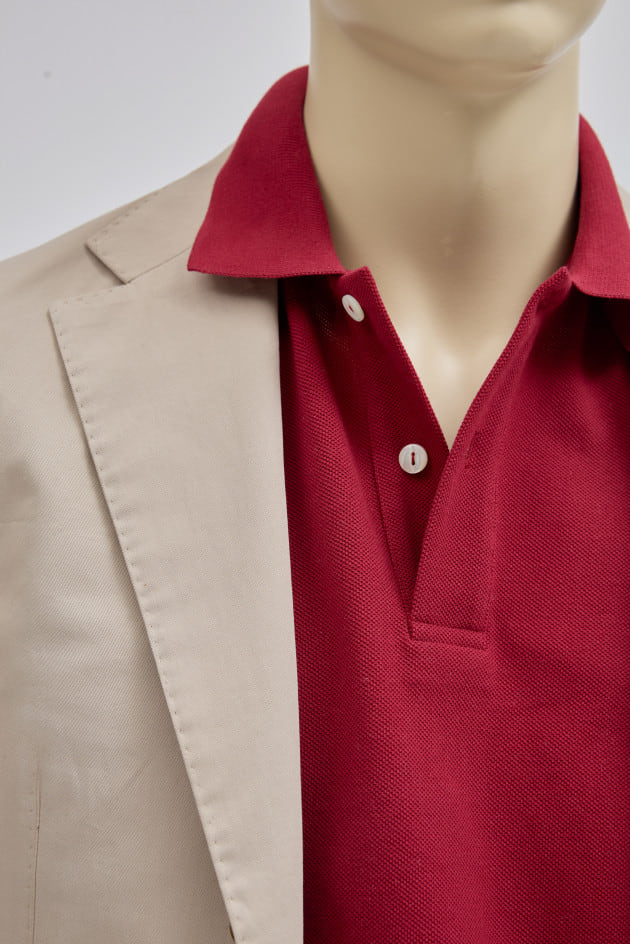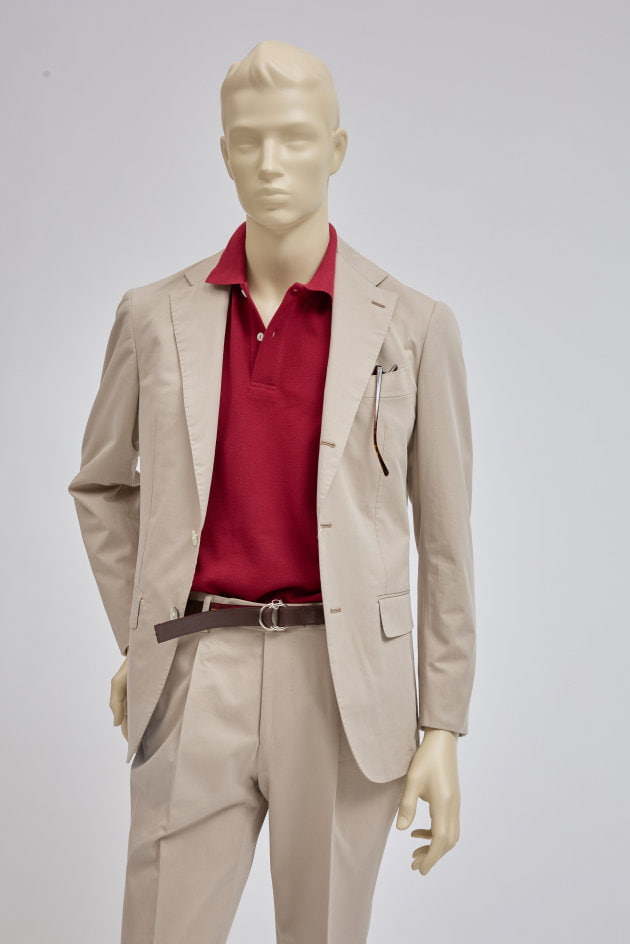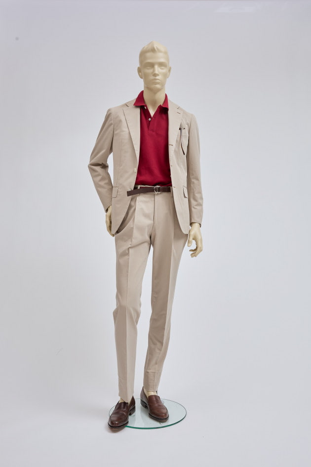 トラッドな着こなしももちろんおすすめ。コットンスーツのインナーに。ベージュとレッドのマッチングが、男っぽくこなれています。それでもどこかしなやかなのは、〈ELACIO〉の持つフレンチさ故。トラッドなブランドにはなかなか出せないニュアンスです。