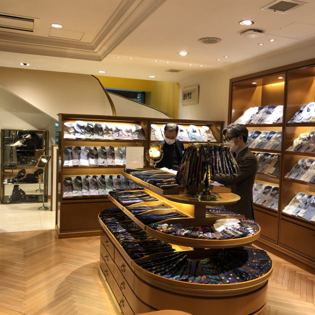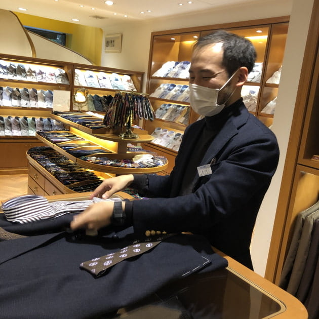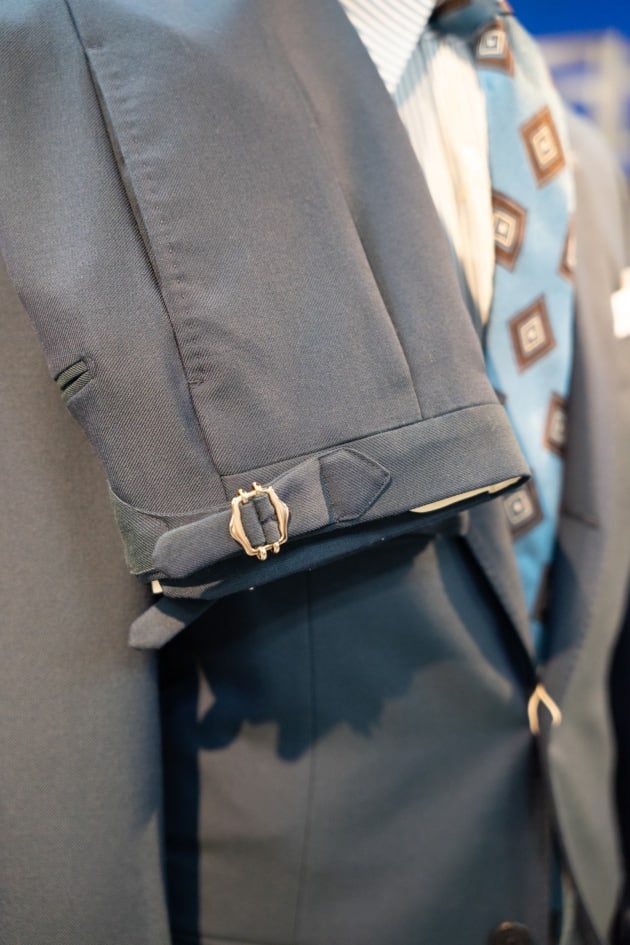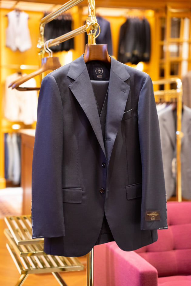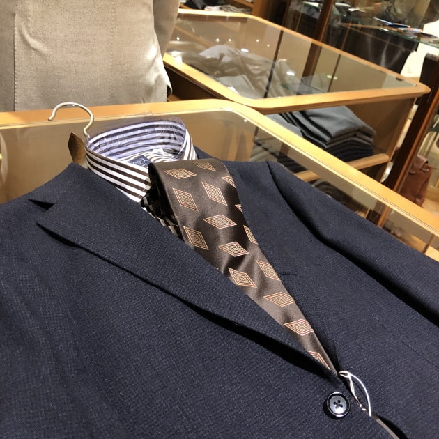 製品があると仕上がりがイメージしやすいですね。実際このスーツがいいなと思い、去年からスーツを買おうか迷ったのですが、このスーツと似たベージュのCarusoのスーツを持っているのと、既製のスーツを買うとパンツを大改造しなければいけないので、最初からオーダーでカスタムできるというのもオーダーに傾いた要因ですね。