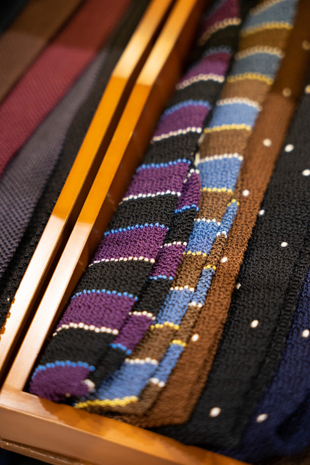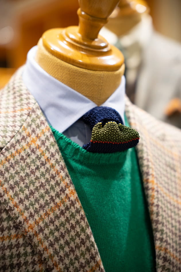 少し捻ってダークブラウンスーツとの合わせが新鮮に感じます。