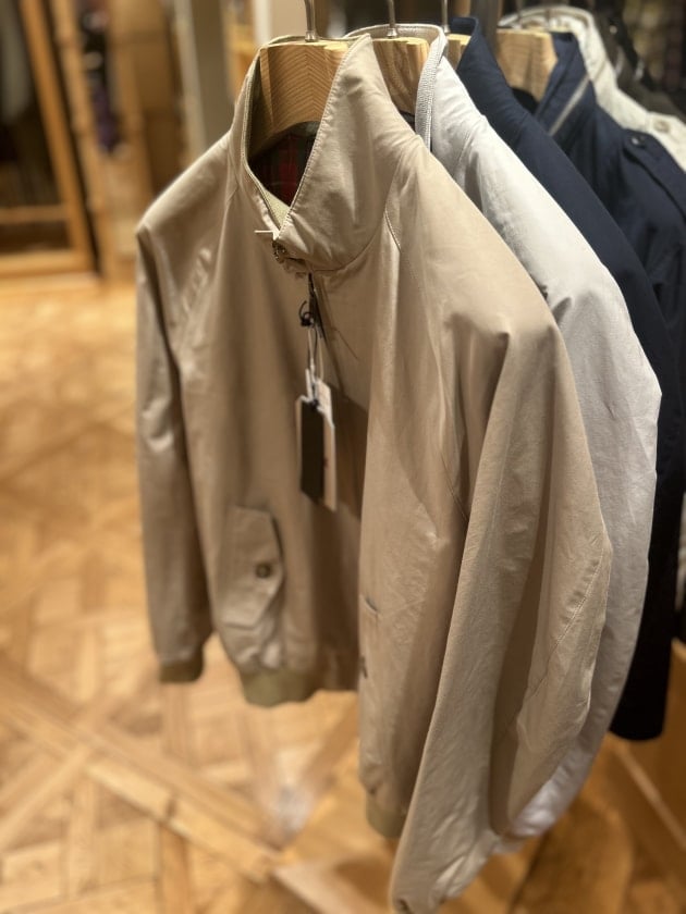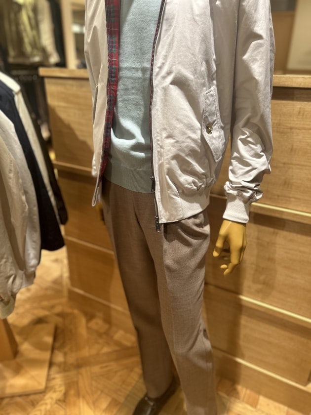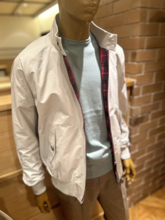 <BARACUTA>を代表する"G9"ジャケットをモチーフにしたスイングトップ型ブルゾンがベースです。 <Barbour>のワックスコットンやジップ等のディテールを組み合わせて特別な一着に仕上げました。