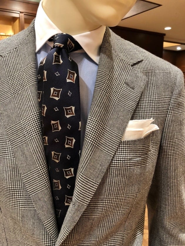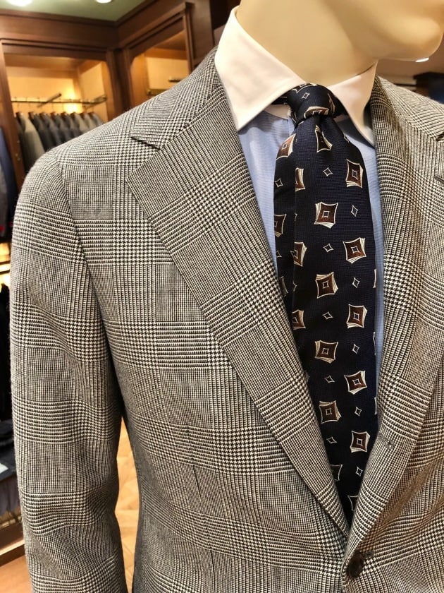 光沢のあるストライプ柄のエレガントな表情のスーツをより引き立てるクレリックシャツに、グレンチェックのネクタイを合わせた英国紳士な気分でまとめて。