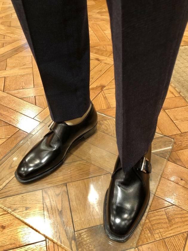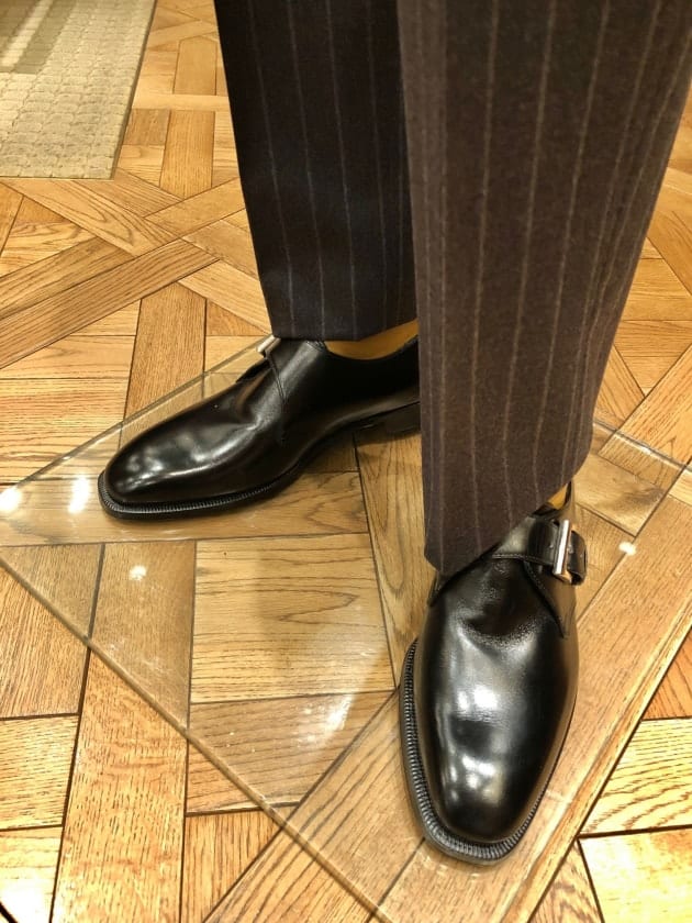 ブラックカーフのウイングチップシューズがピッタリ!今回の英国的な着こなしをグッと引き締めますね。