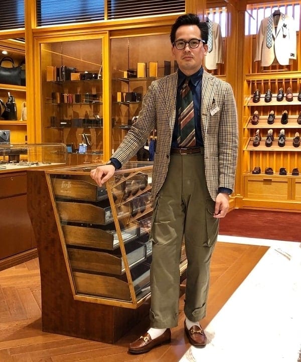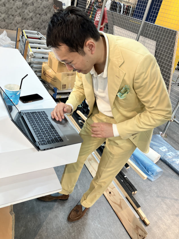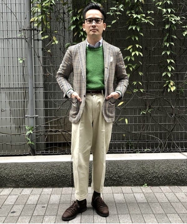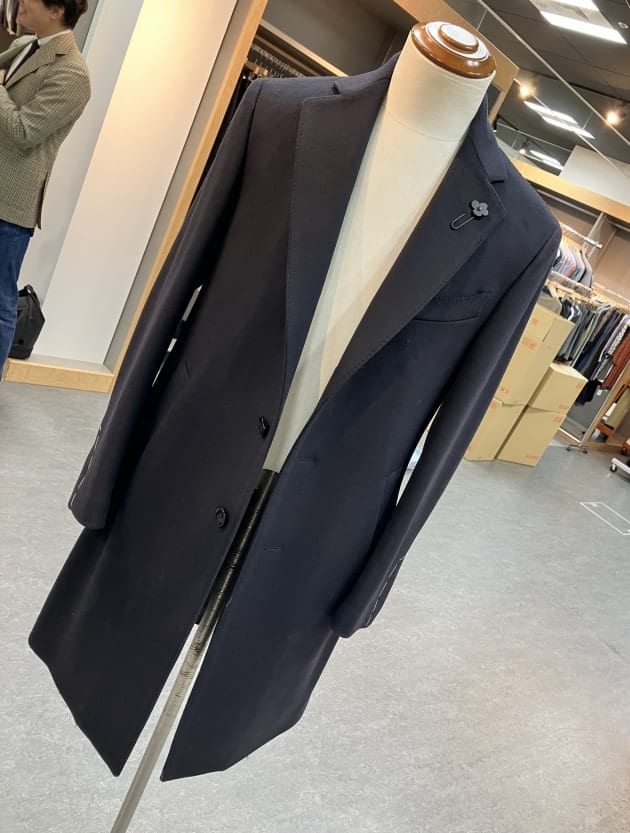 モデル「ROMA」。デザインは2つボタンのシングル、2パッチポケット。シルエットはややゆとりのあるバランス。