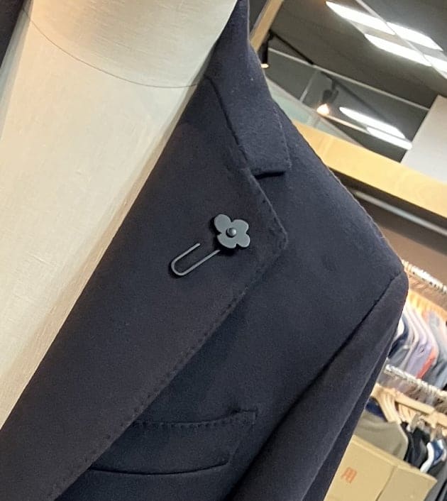 ラペルにはブランドのアイコンとなるピンがポイントに。