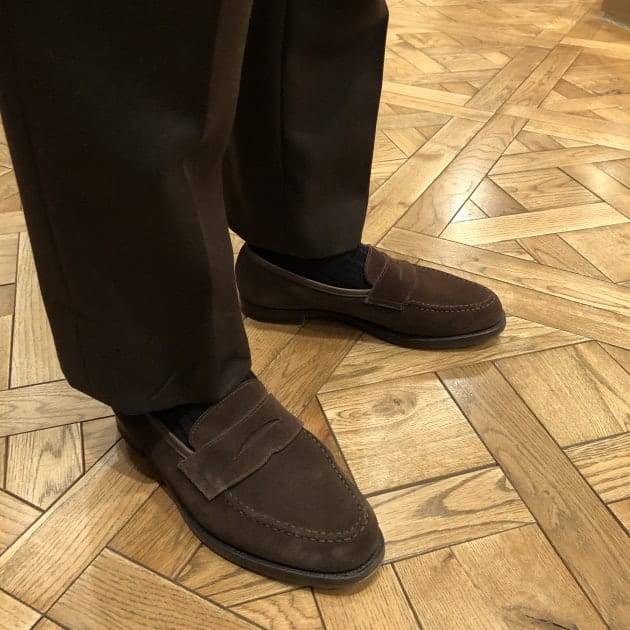 そんなポロシャツを活かしたコーディネートのポイントはウール100%のスーツにカノコの素材感を馴染ませるためにスポーティーなパターンのスーツと軽快なシューズを選んだ点にあります。スーツの生地は<JOHN FOSTER>のシェパードチェック。シューズは<CROCKETT&JONES>のヴァンプシューズGAVIN。
