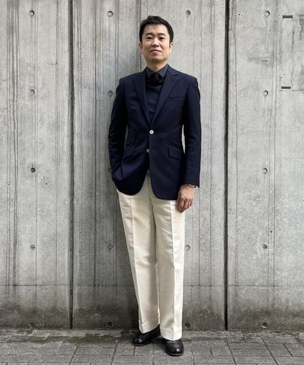 サイズは34をセレクトし、窮屈さもなくキレイに合わせていてスッキリとした印象ですね。