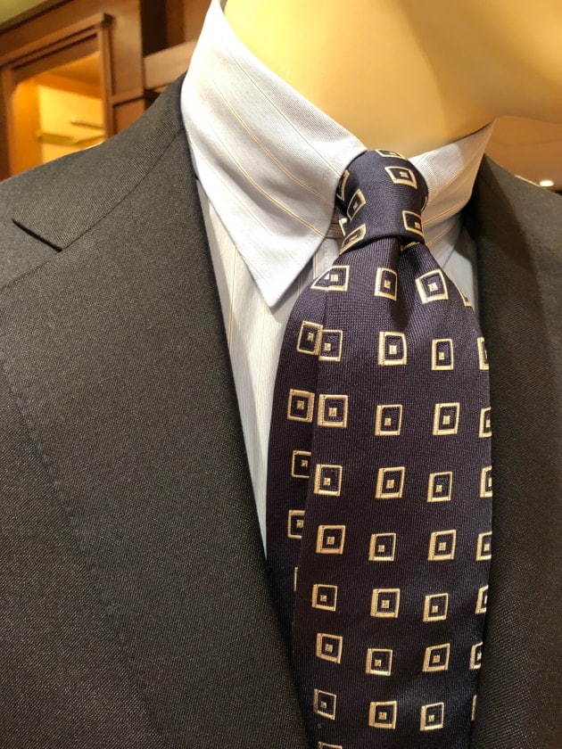 ネイビーにグレーを混ぜたような色合いのスーツに合わせて、トーンを抑えたグレーストライプシャツにブルーグレーのネクタイでノンシャラン(気取らない)な雰囲気でコーディネート。