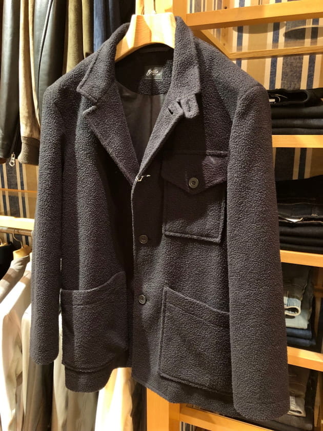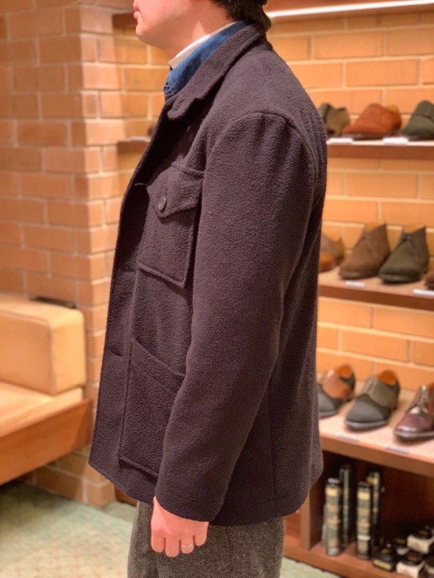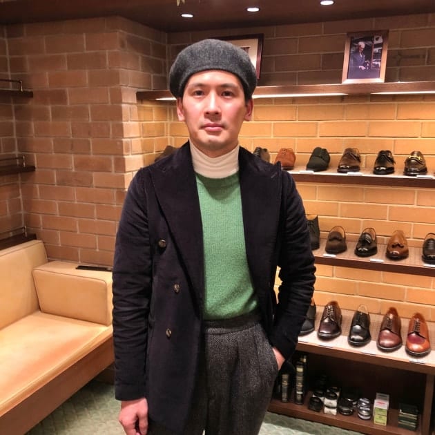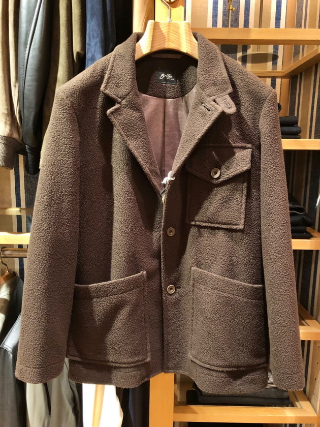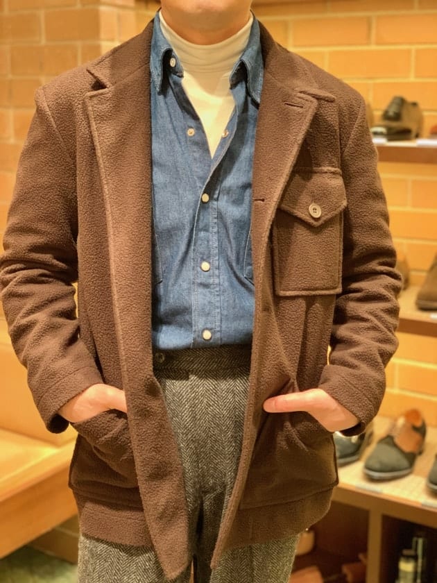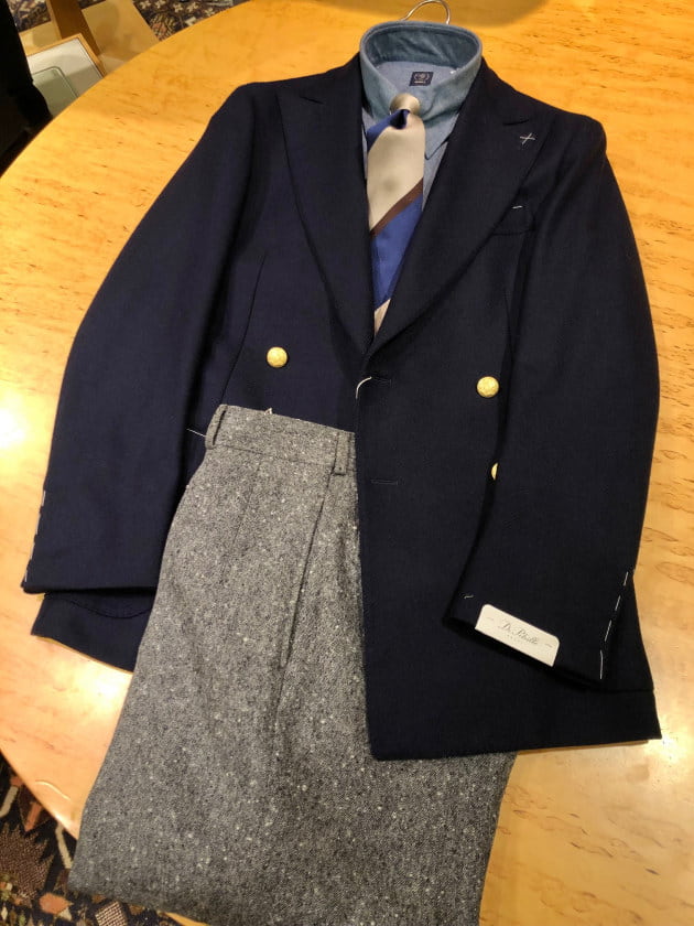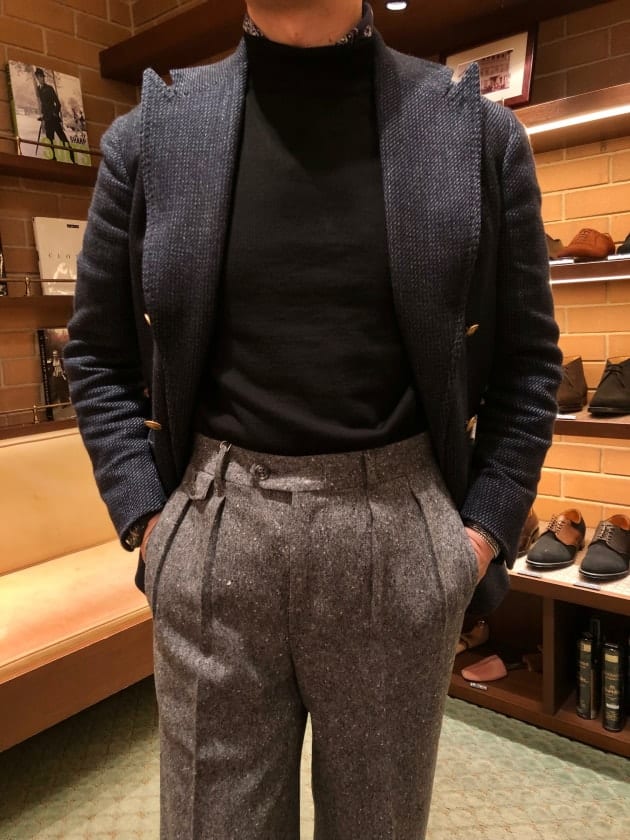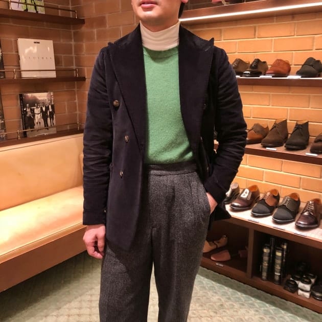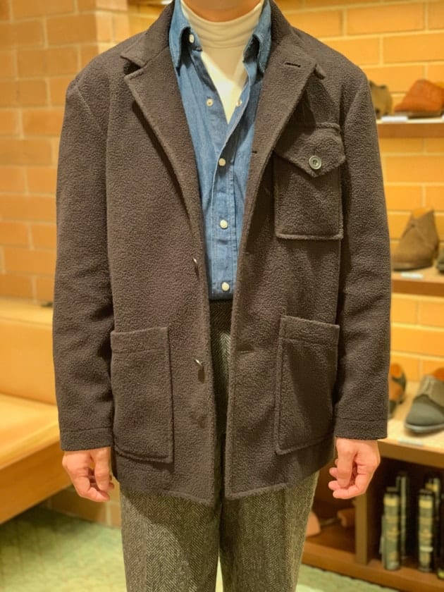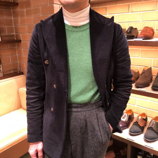 4つボタンダブルの別注ショールカラーニットジャケットが本日の主役。