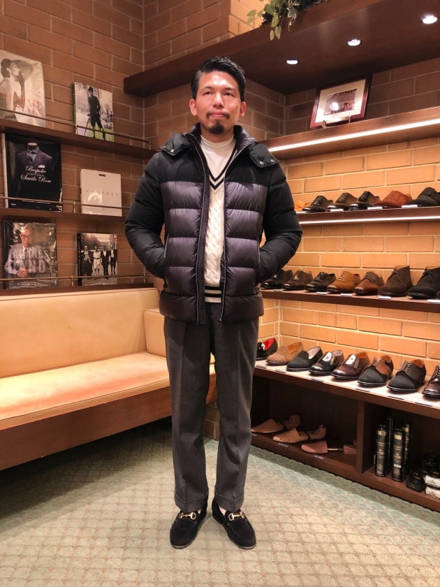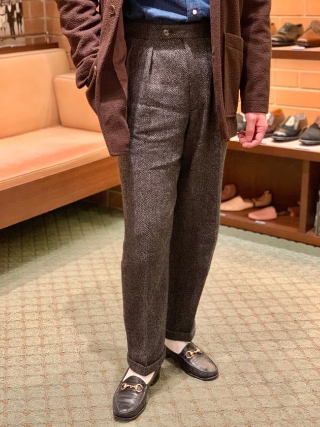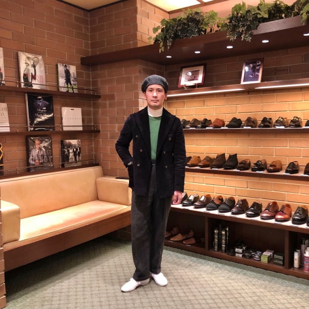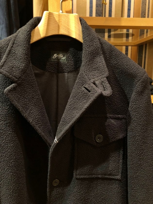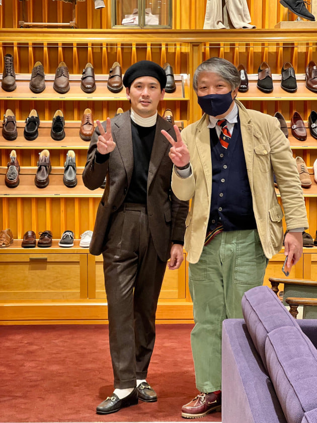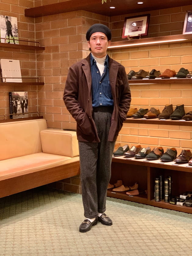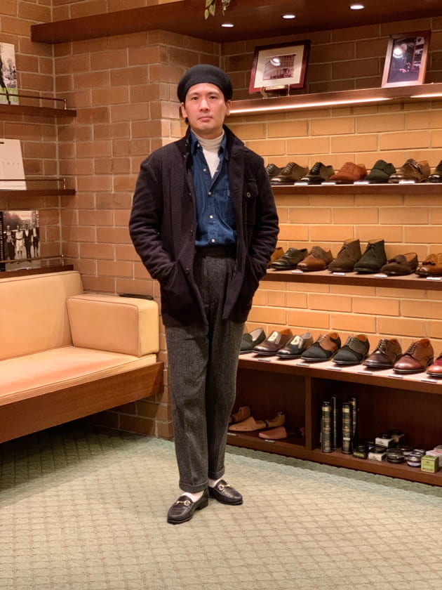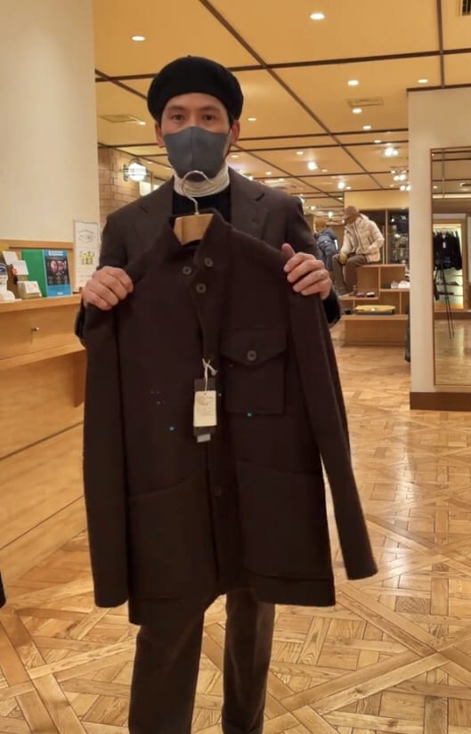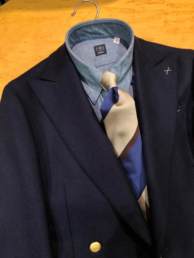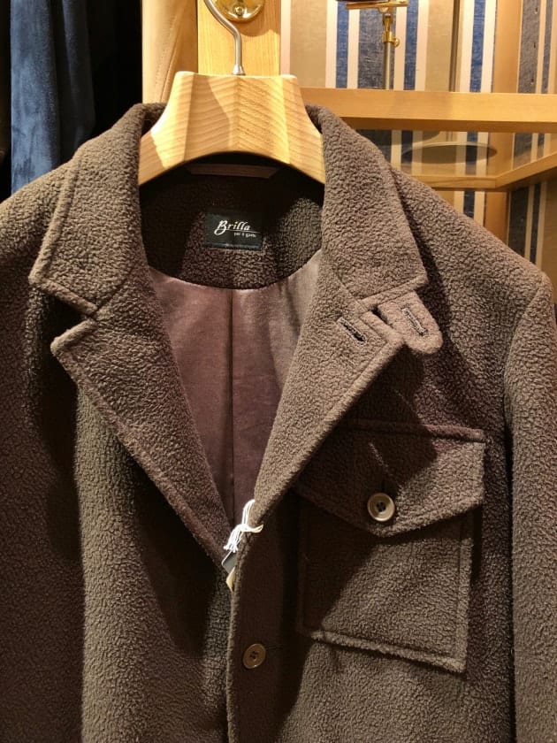 4つボタンダブルの別注ショールカラーニットジャケットが本日の主役。