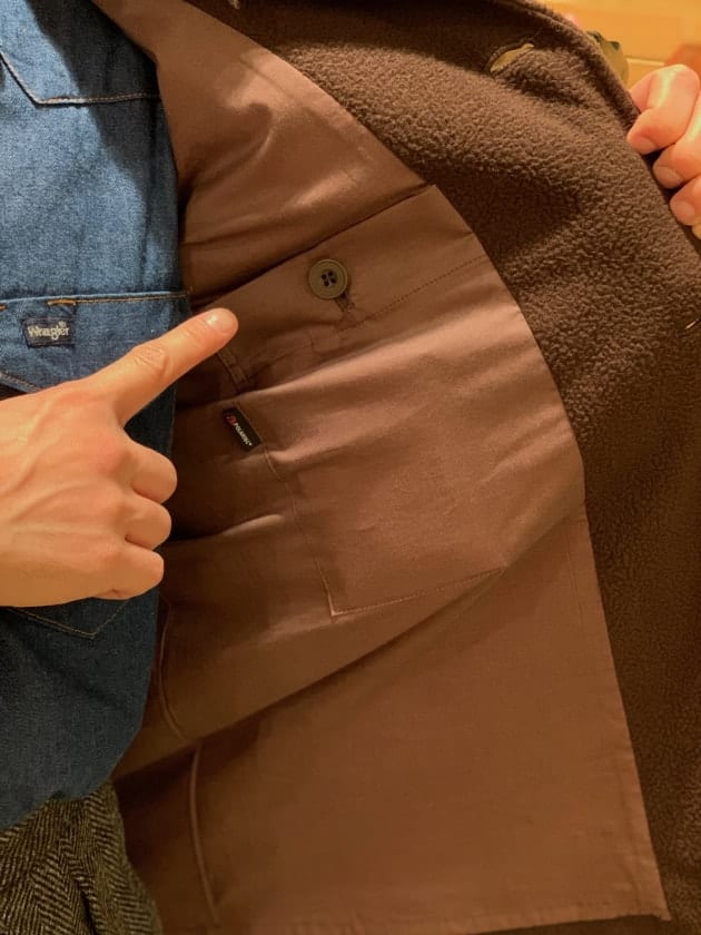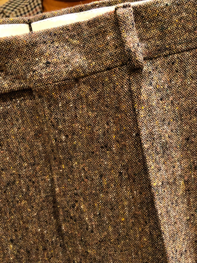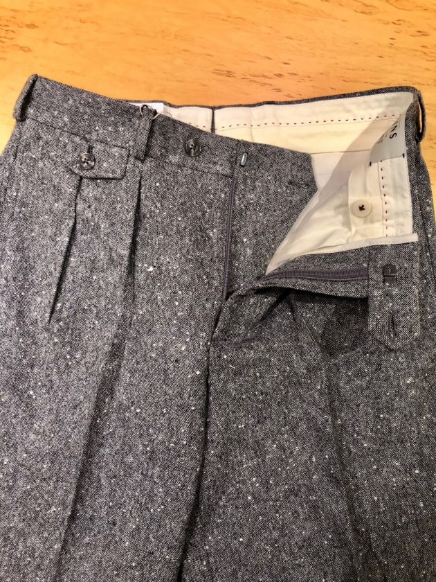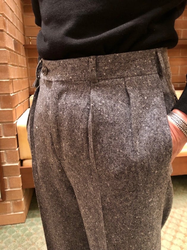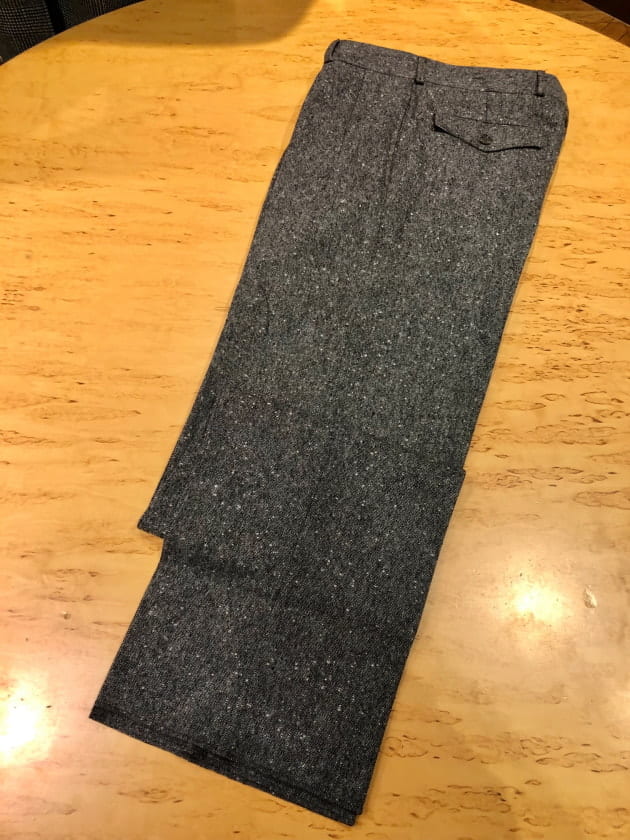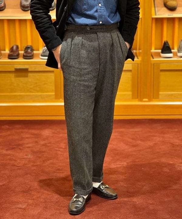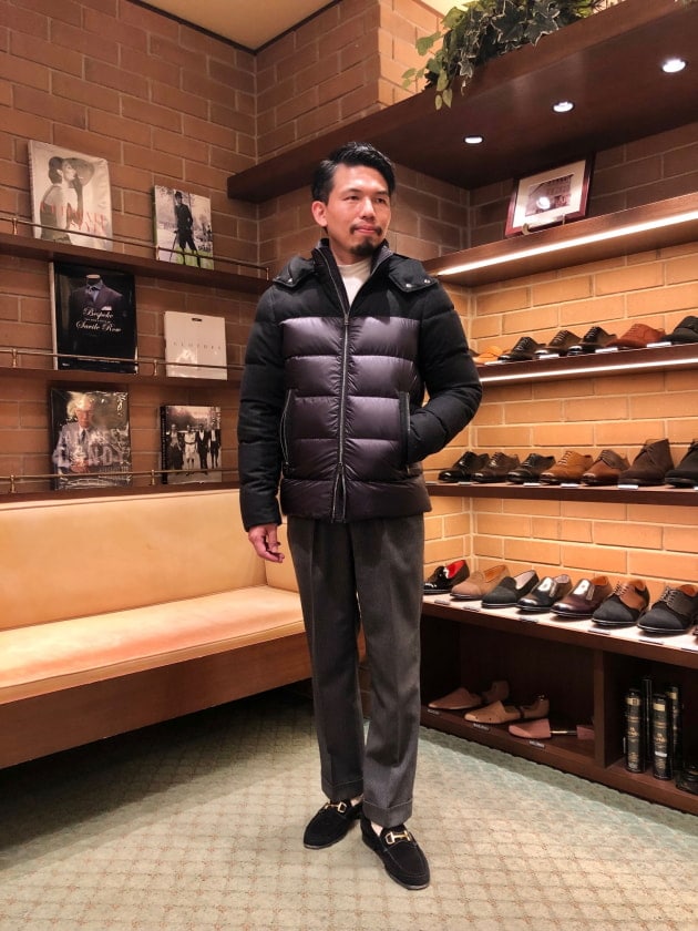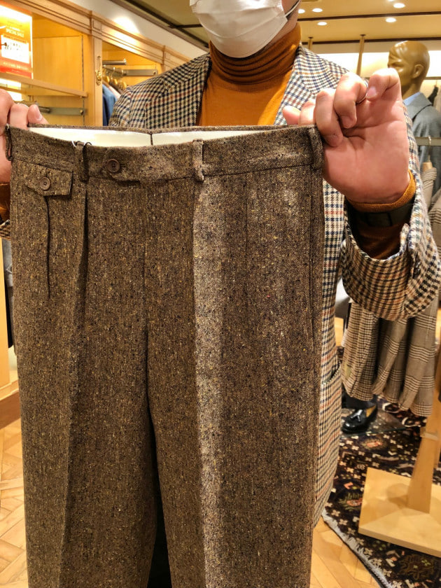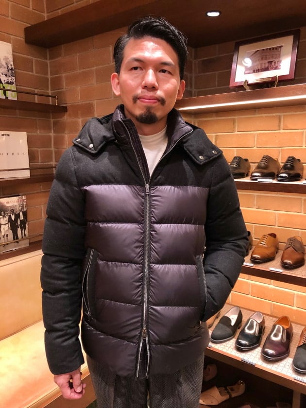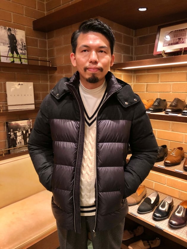 4つボタンダブルの別注ショールカラーニットジャケットが本日の主役。