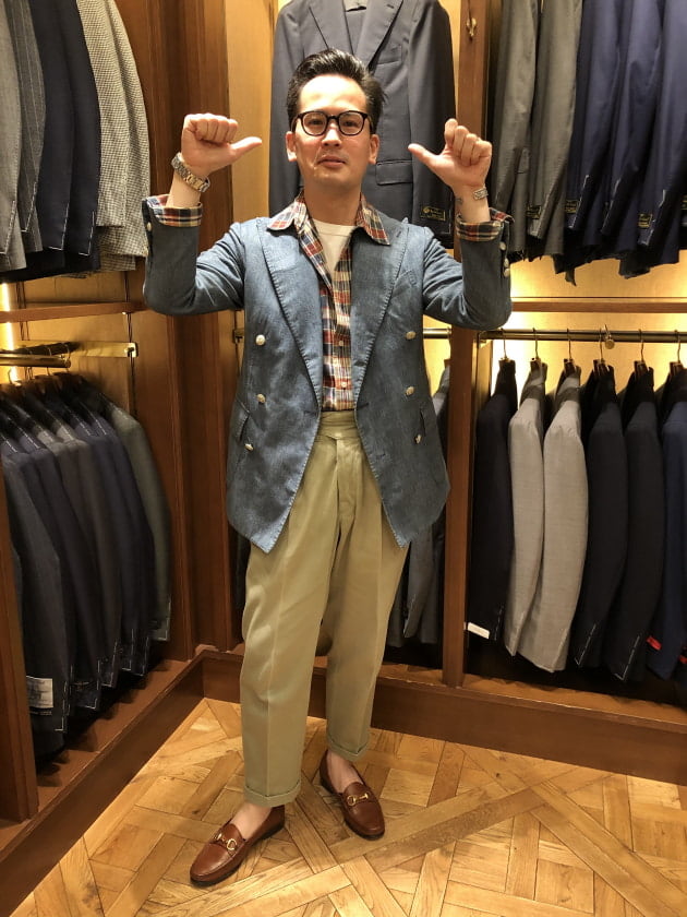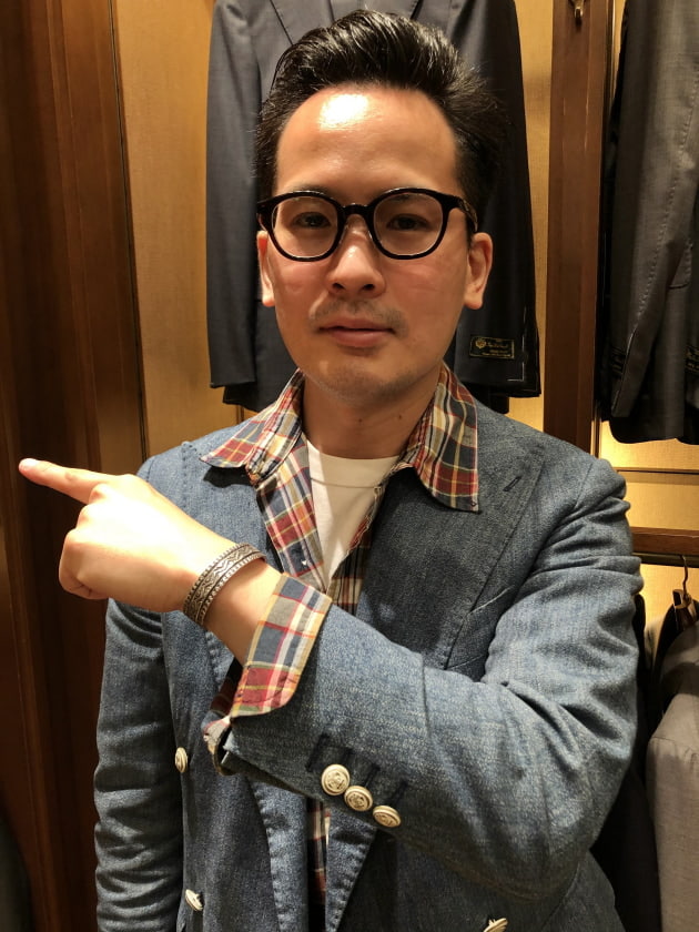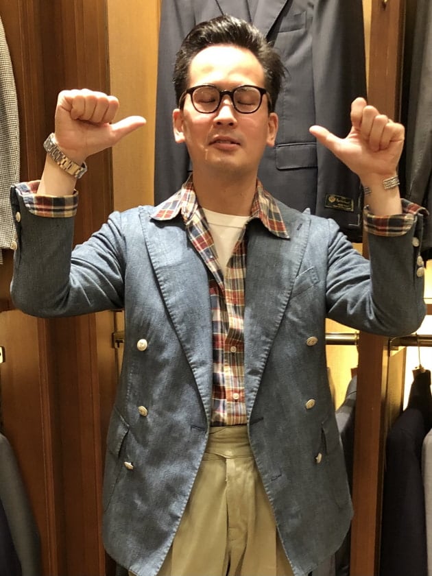 スーツコーナーにてスタートした、ディレクター西口オススメのアイテム紹介。