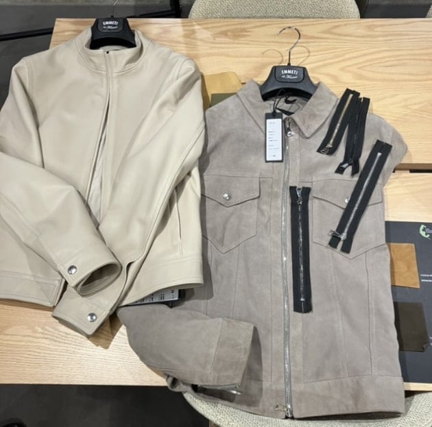 ベストセラーモデル"JURI(ユリ)"をベースにシングルライダース特有の襟に付くストラップを排除したミニマムなデザインが特徴で、下の写真から分かるように、フロントジップを下げた時に外側へ綺麗に開く襟がシャツやスカーフと好相性です。