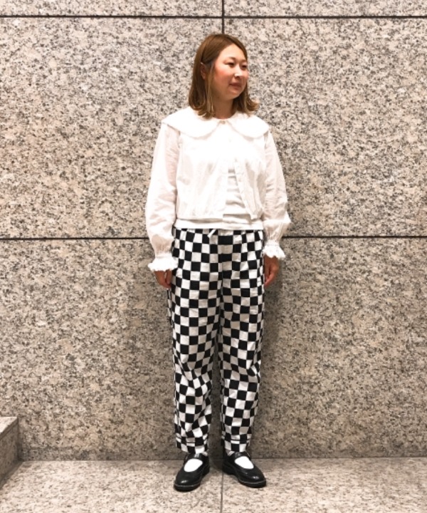 こちらは女性らしいフリルシャツにメンズライクなパンツを合わせた、MIXスタイルのコーディネートです。