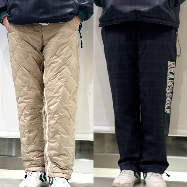 ブルゾンと同素材を使用した、中綿入りの防寒パンツ。